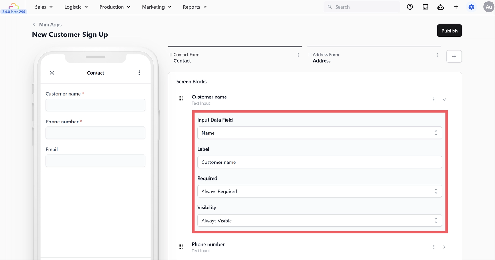For example, you could add an Email field to the Contact screen, collect a preferred contact time, or โ as shown below โ make Address Line 2 mandatory only for certain property types.
