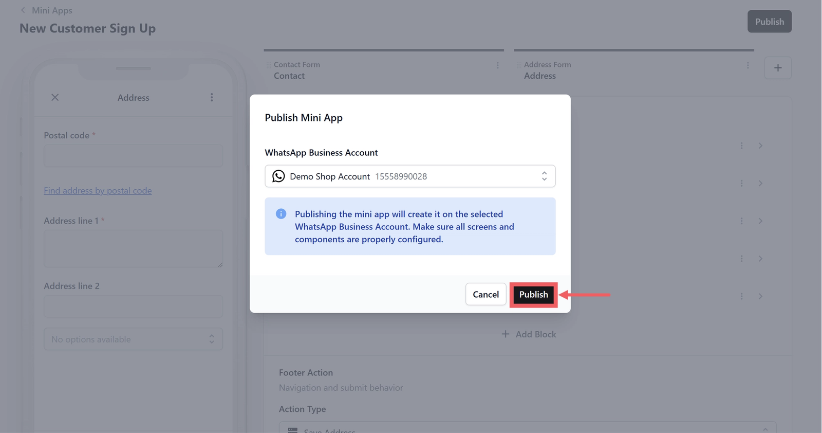 - A confirmation dialog box will pop up. Ensure your WhatsApp Business Account is selected correctly, then click Publish.