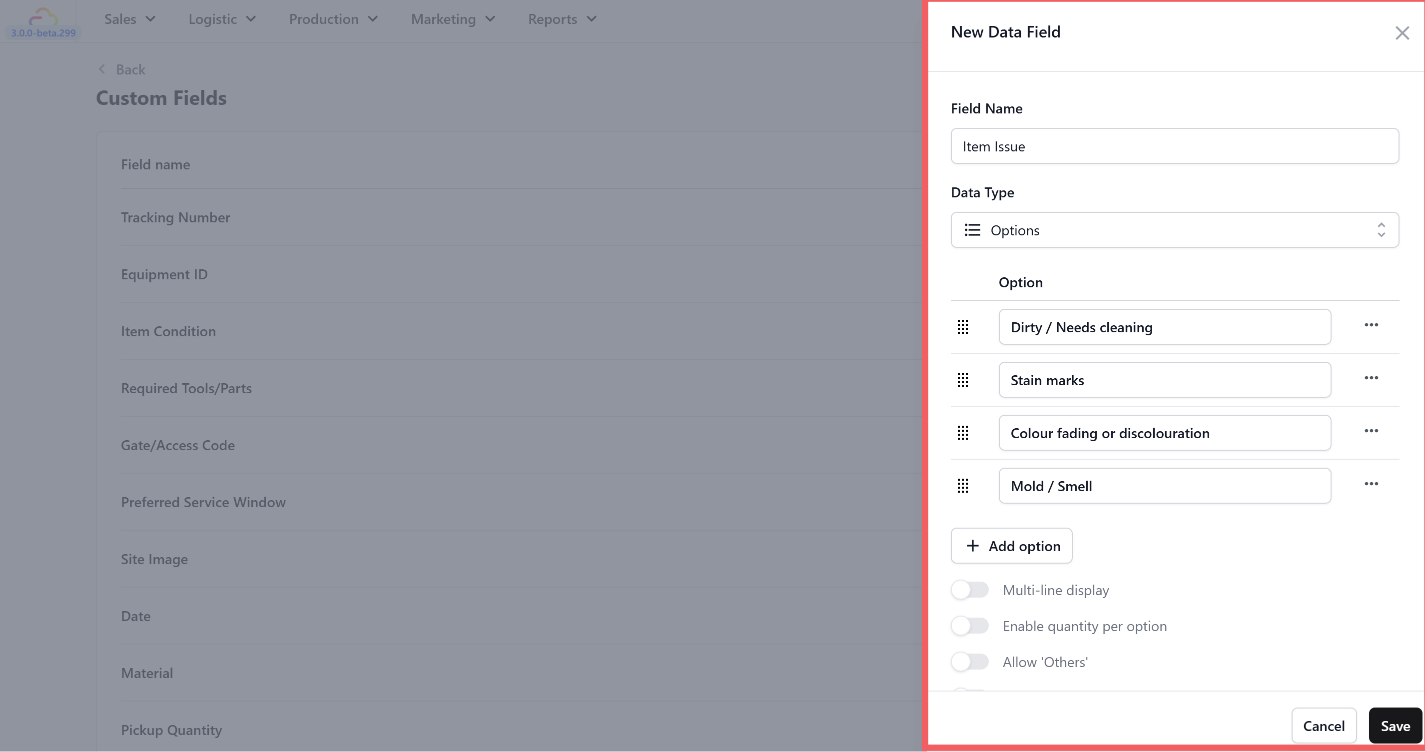 - Name it Item Issue, choose Item Issue as the Data Type, and add your options (e.g., Dirty / Needs cleaning, Stain marks, Colour fading or discolouration, Mold / Smell). Click Save.