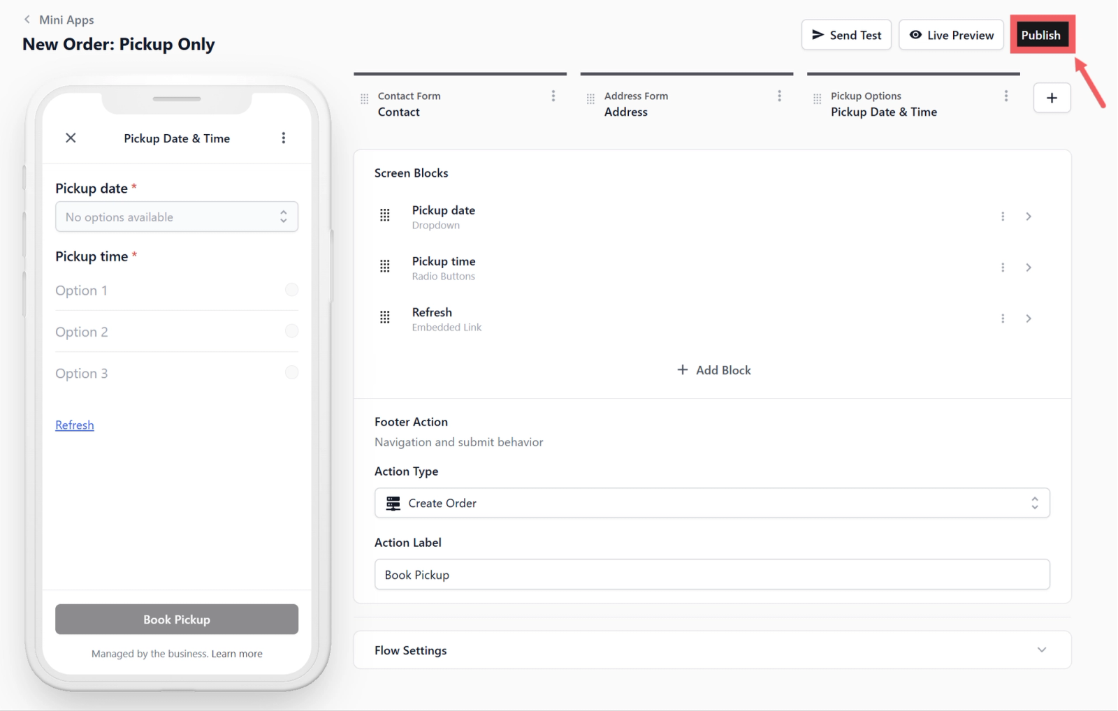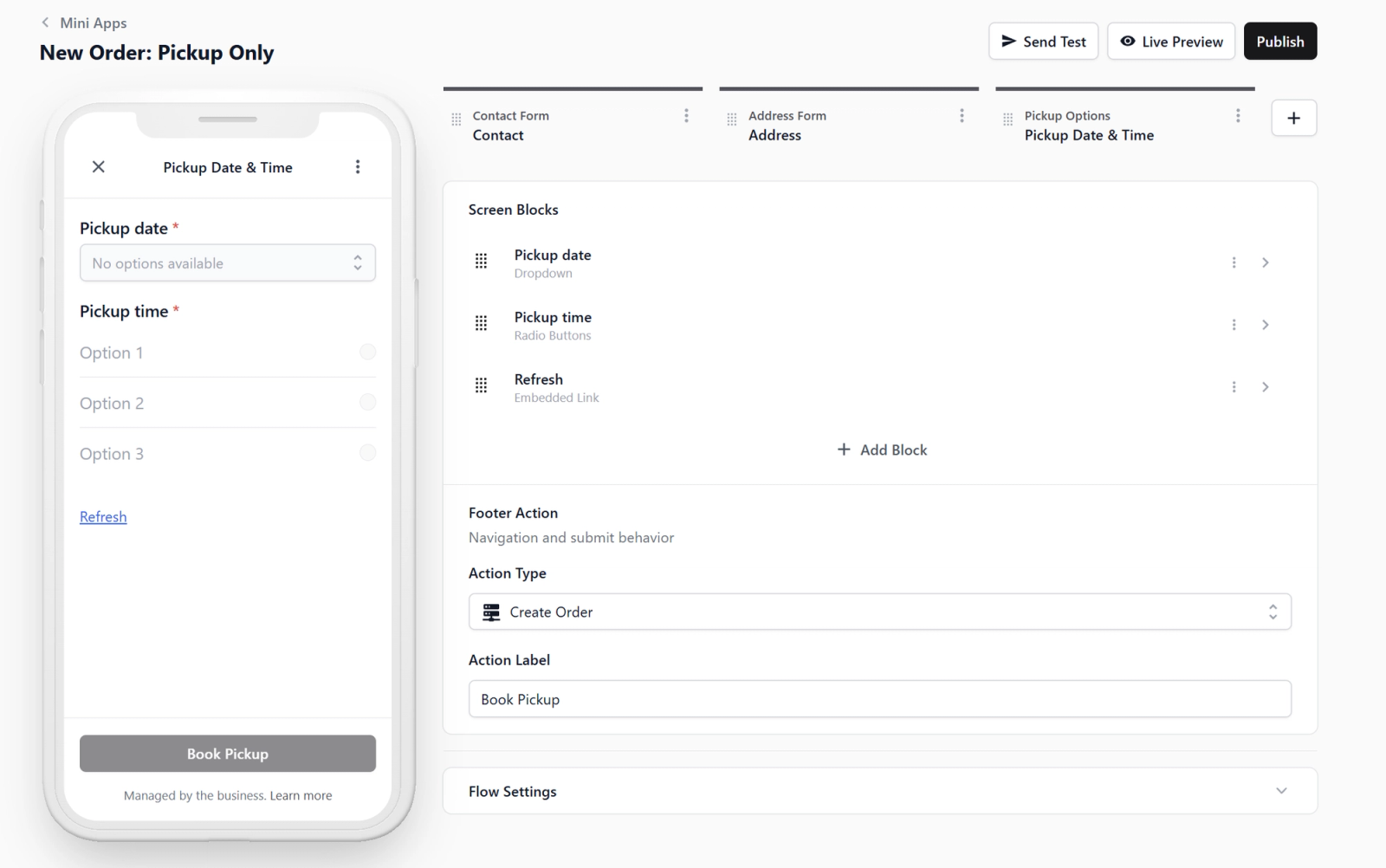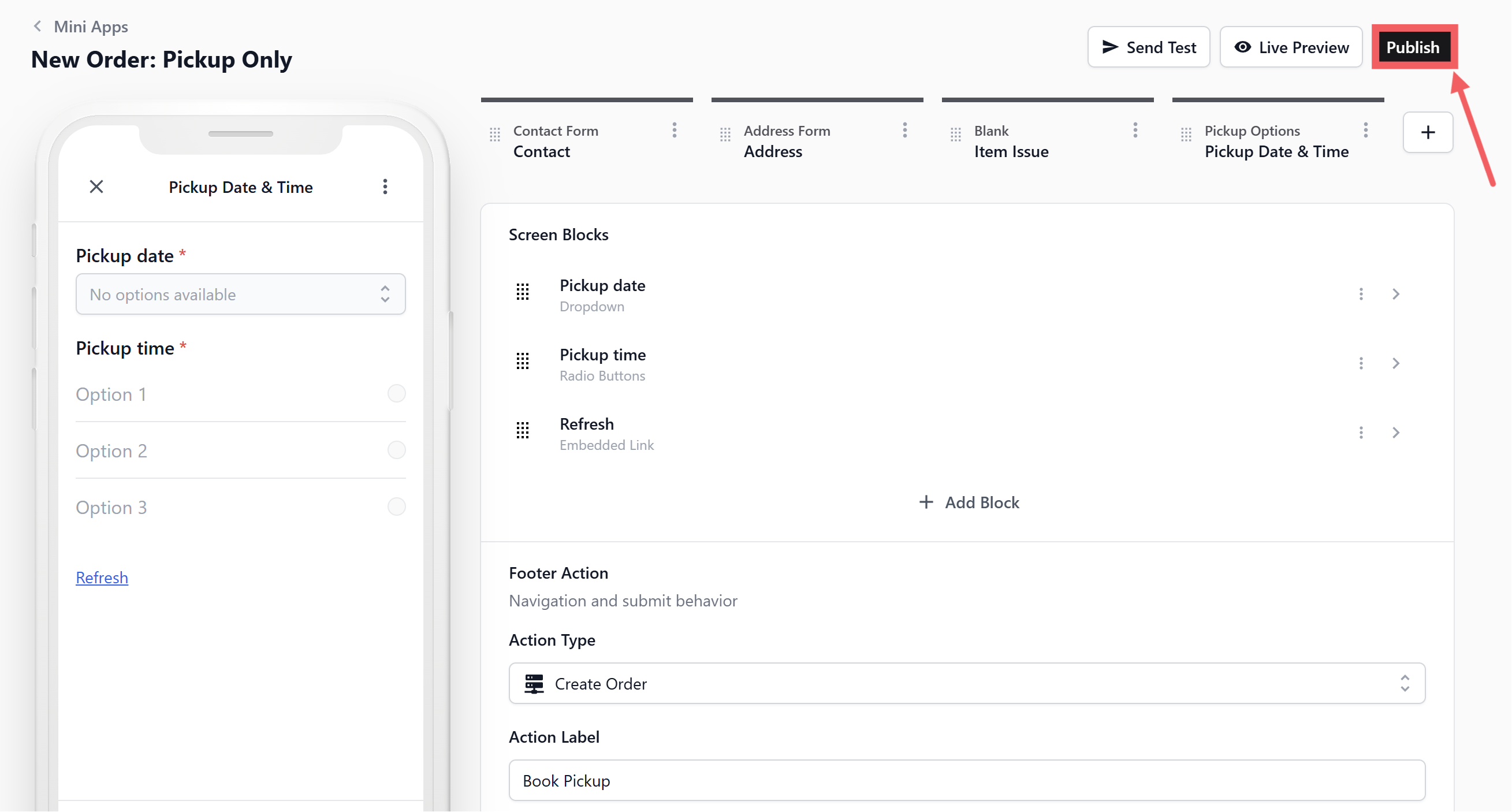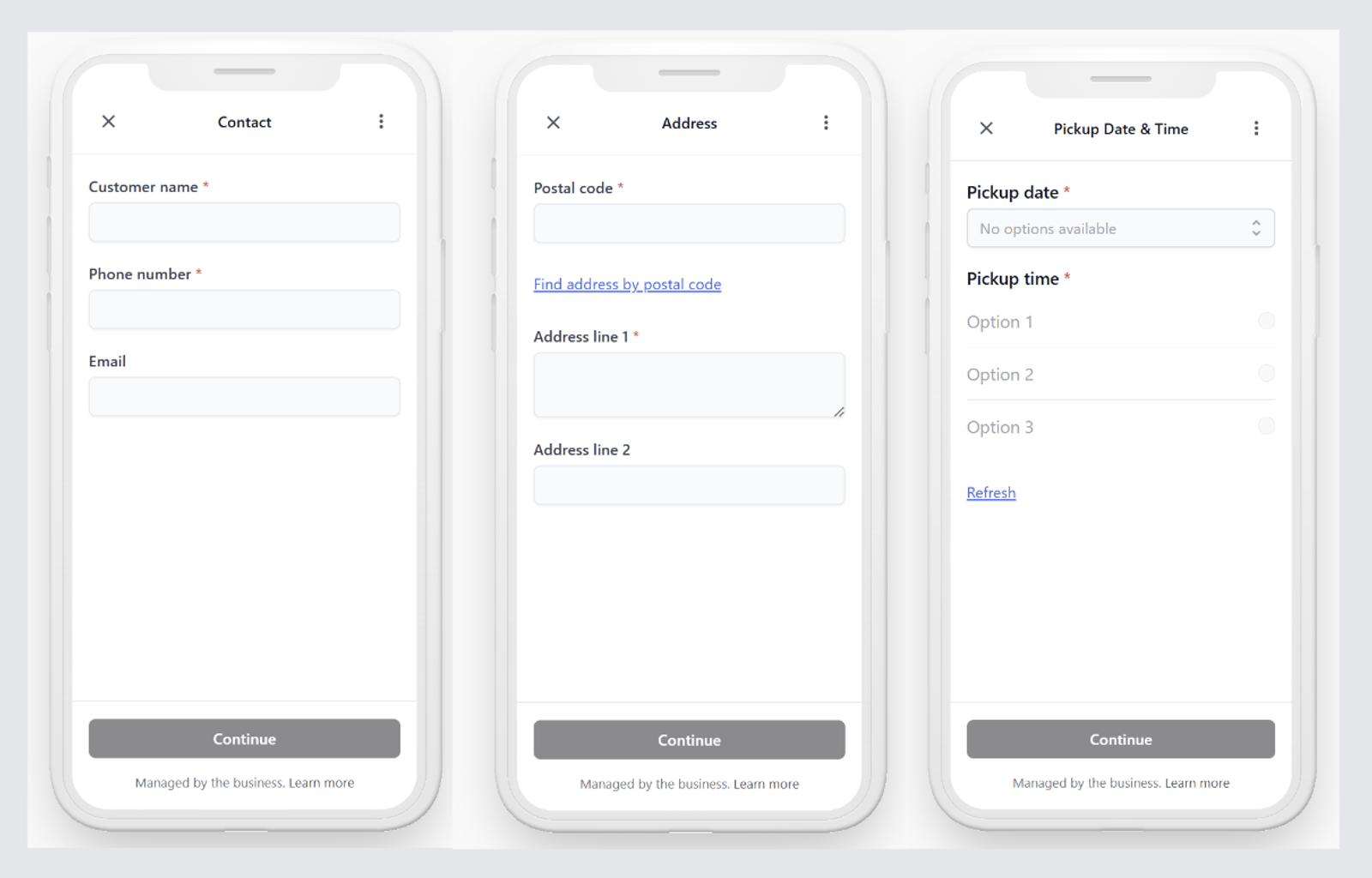 - Blocks Included: Pickup date dropdown, Pickup time options, and a "Refresh" link (in case they need to see the latest available time slots).