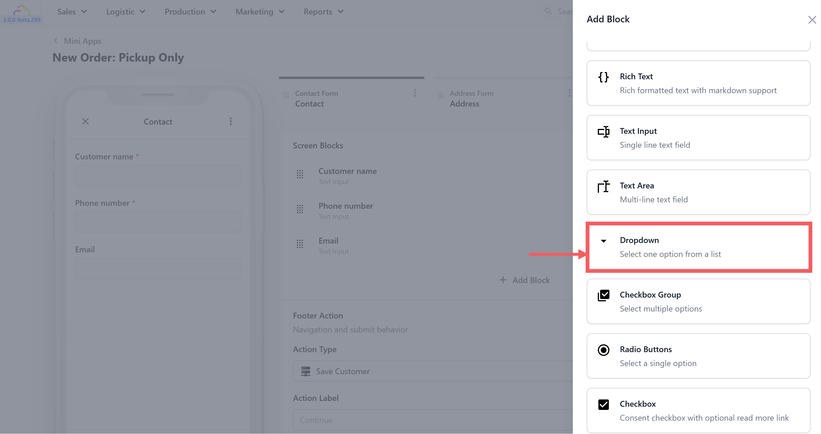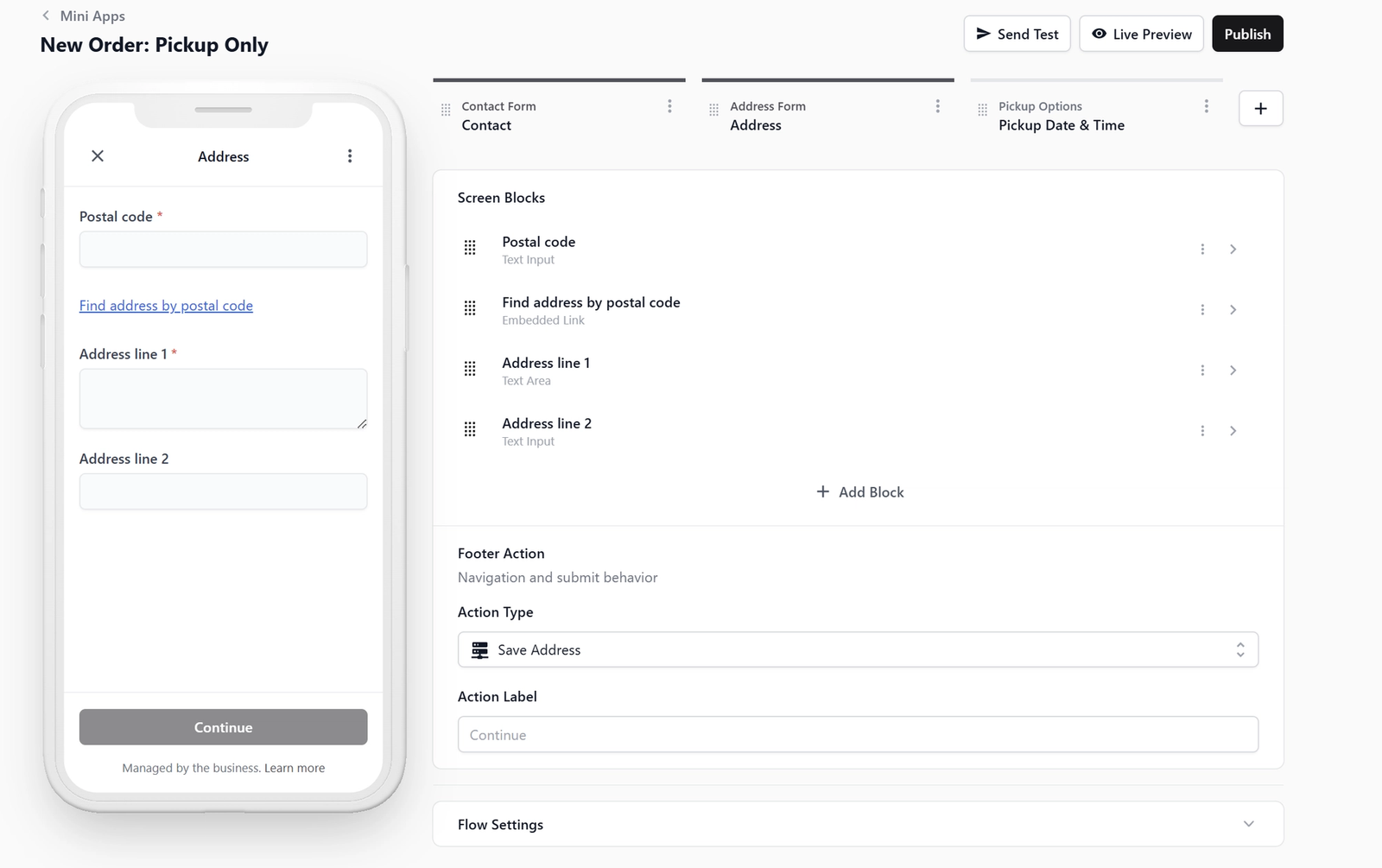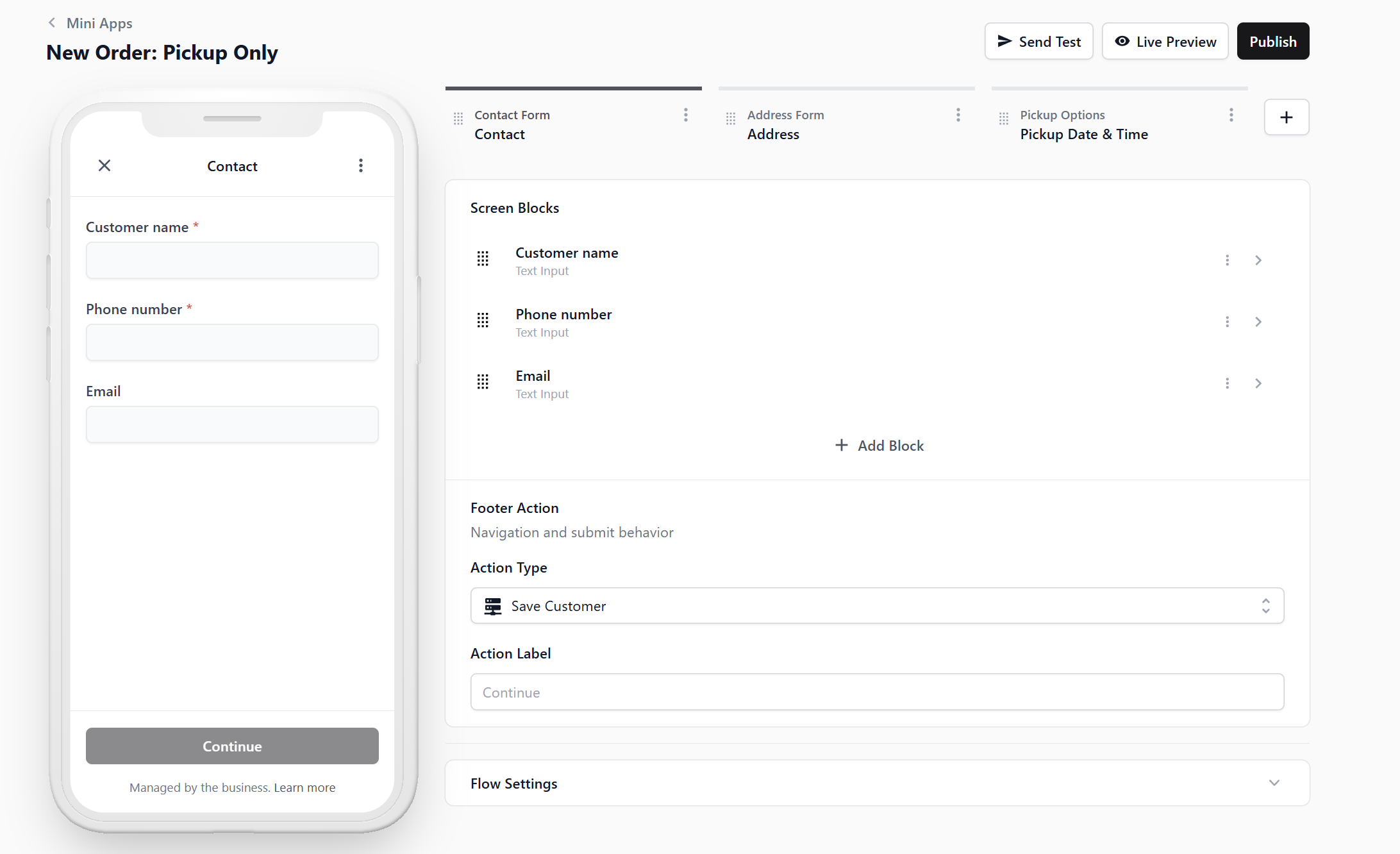 At the very bottom of the editor for each screen, you will see a Footer Action. This controls what the button at the bottom of the customer's phone does when they tap it. It might tell the app to save the customer's details, move to the next page, or finally create the order.