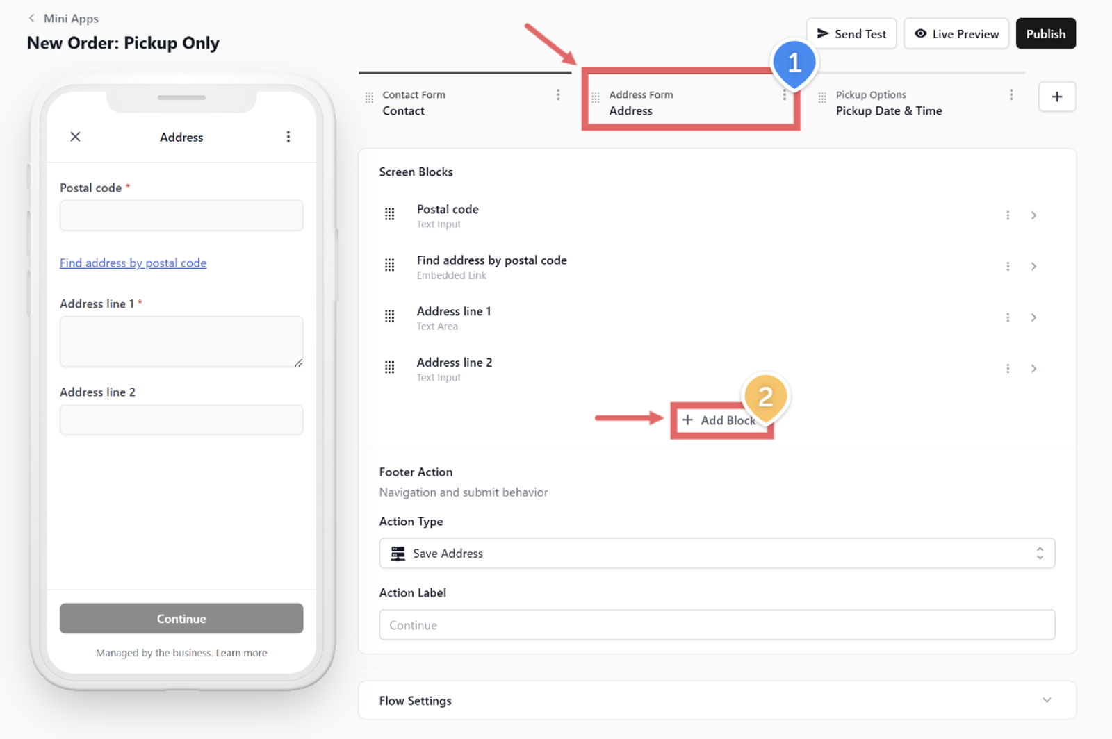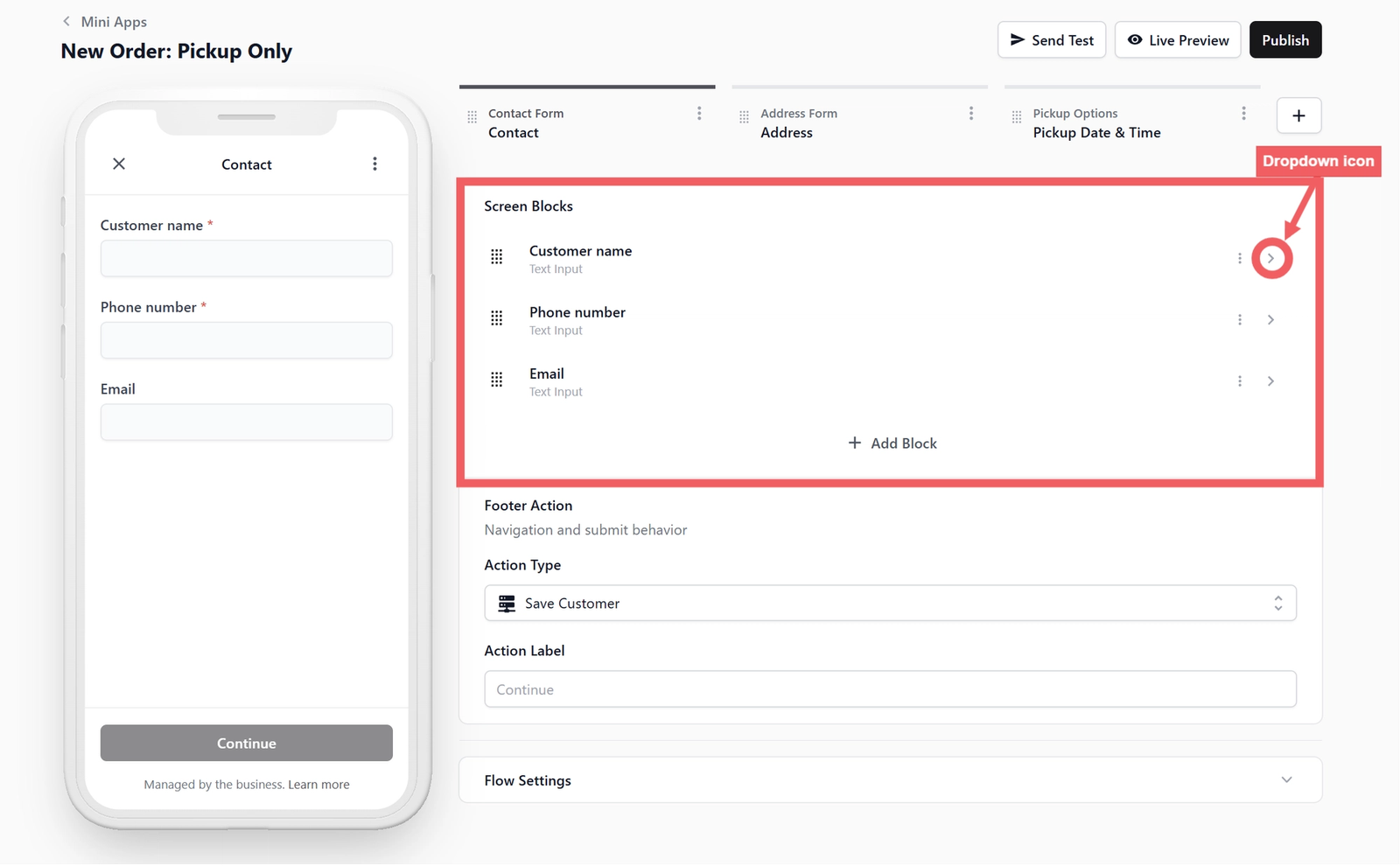 Inside every screen, you will see a list of Screen Blocks. Think of a block as a specific field or question you want the customer to fill out (like their name or their phone number). If you click the dropdown arrow icon ( ⌄ ) next to any block, it will expand to show its settings: