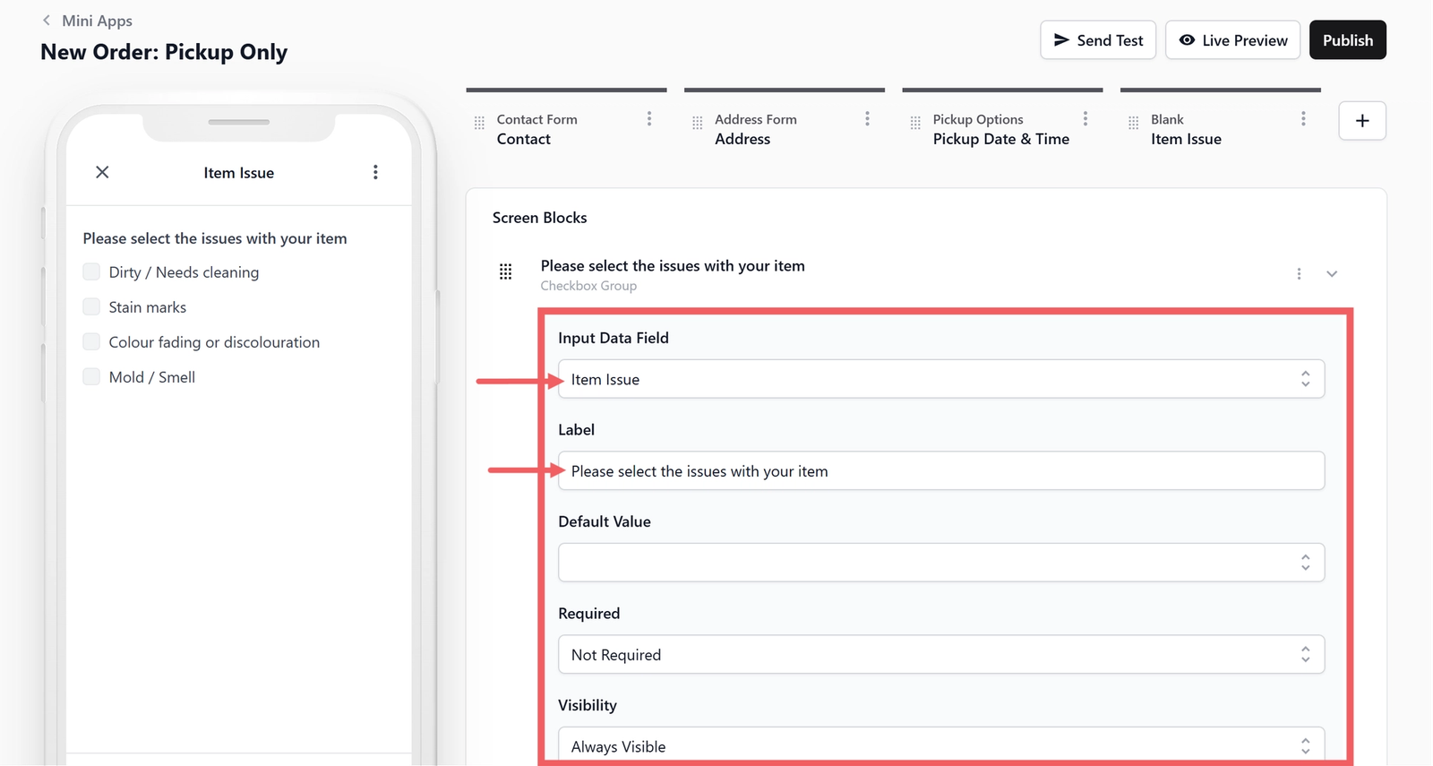 - Open the block settings. Set the Input Data Field to your Item Issue field, and change the Label to "Please select the issues with your item".