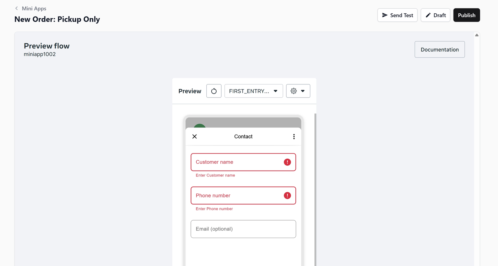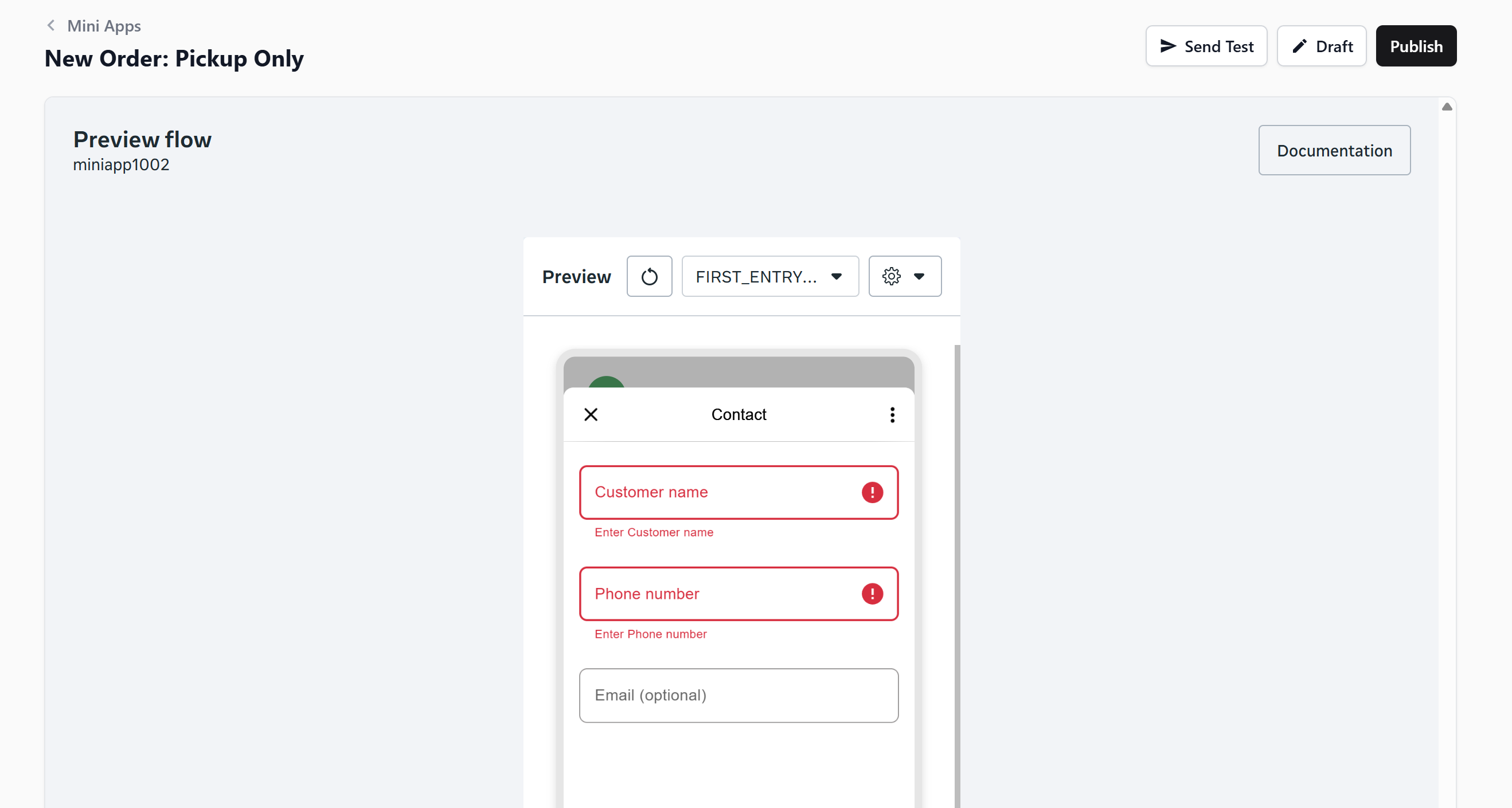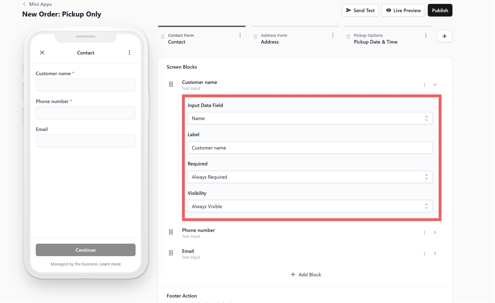 - You will now be taken to the Live Preview screen. This screen shows you exactly what your customer will see and interact with on their phone.