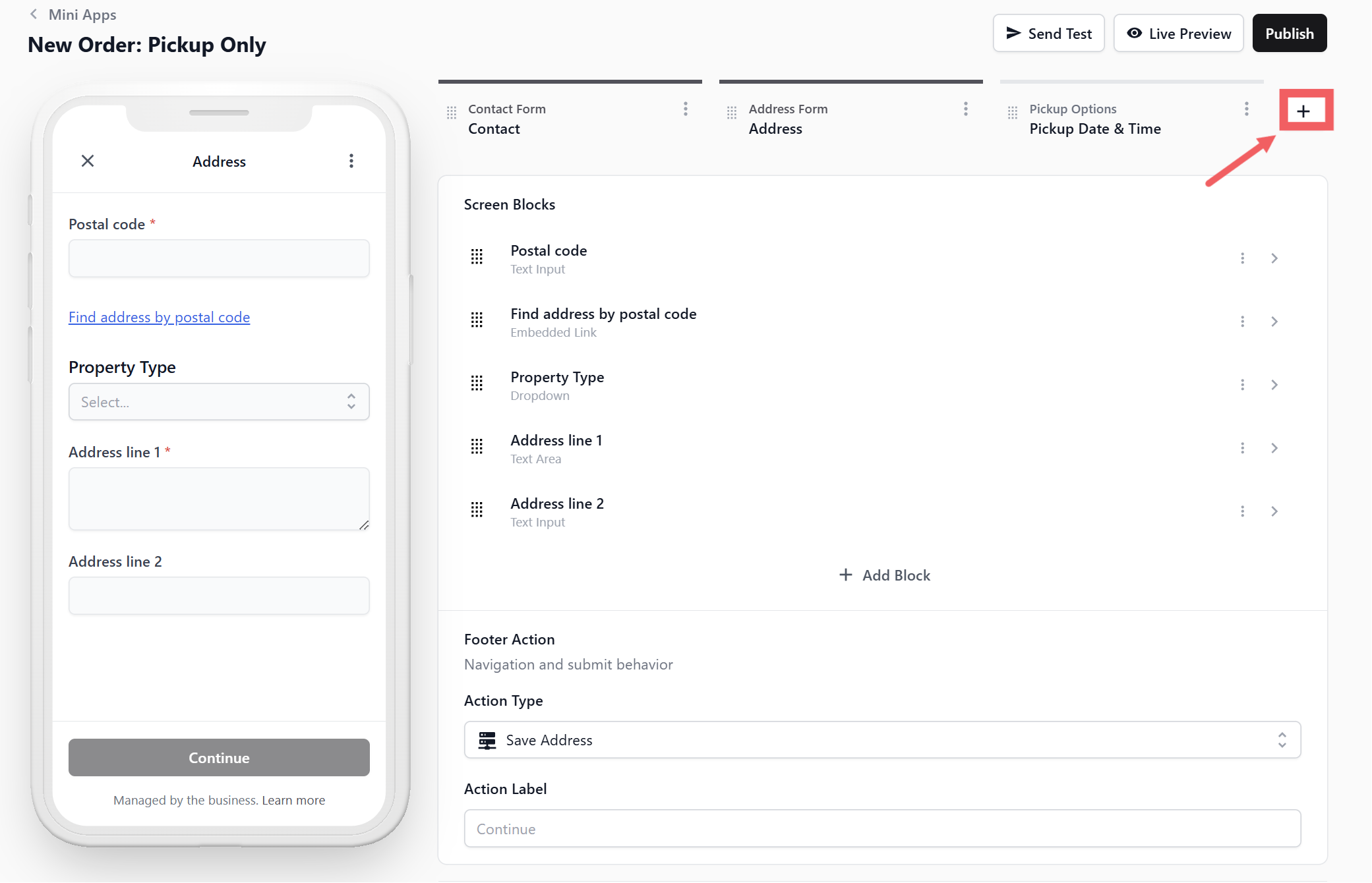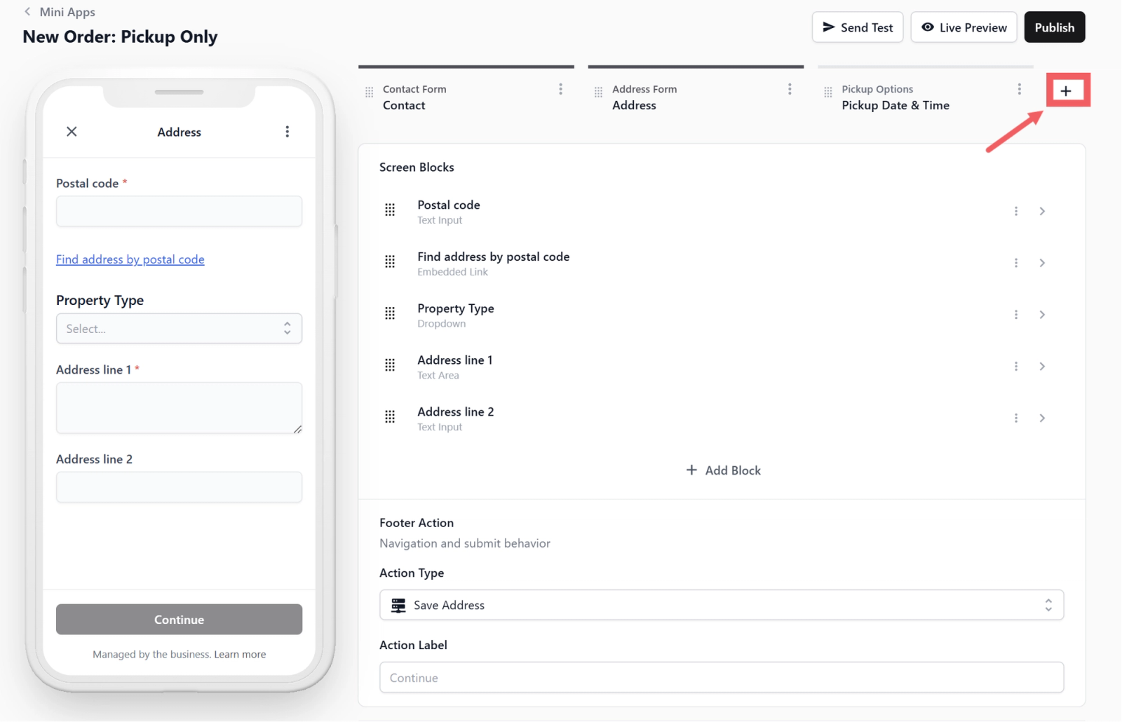 - Back in your Mini App editor, click the + button next to your screen tabs at the top right to Add Screen.