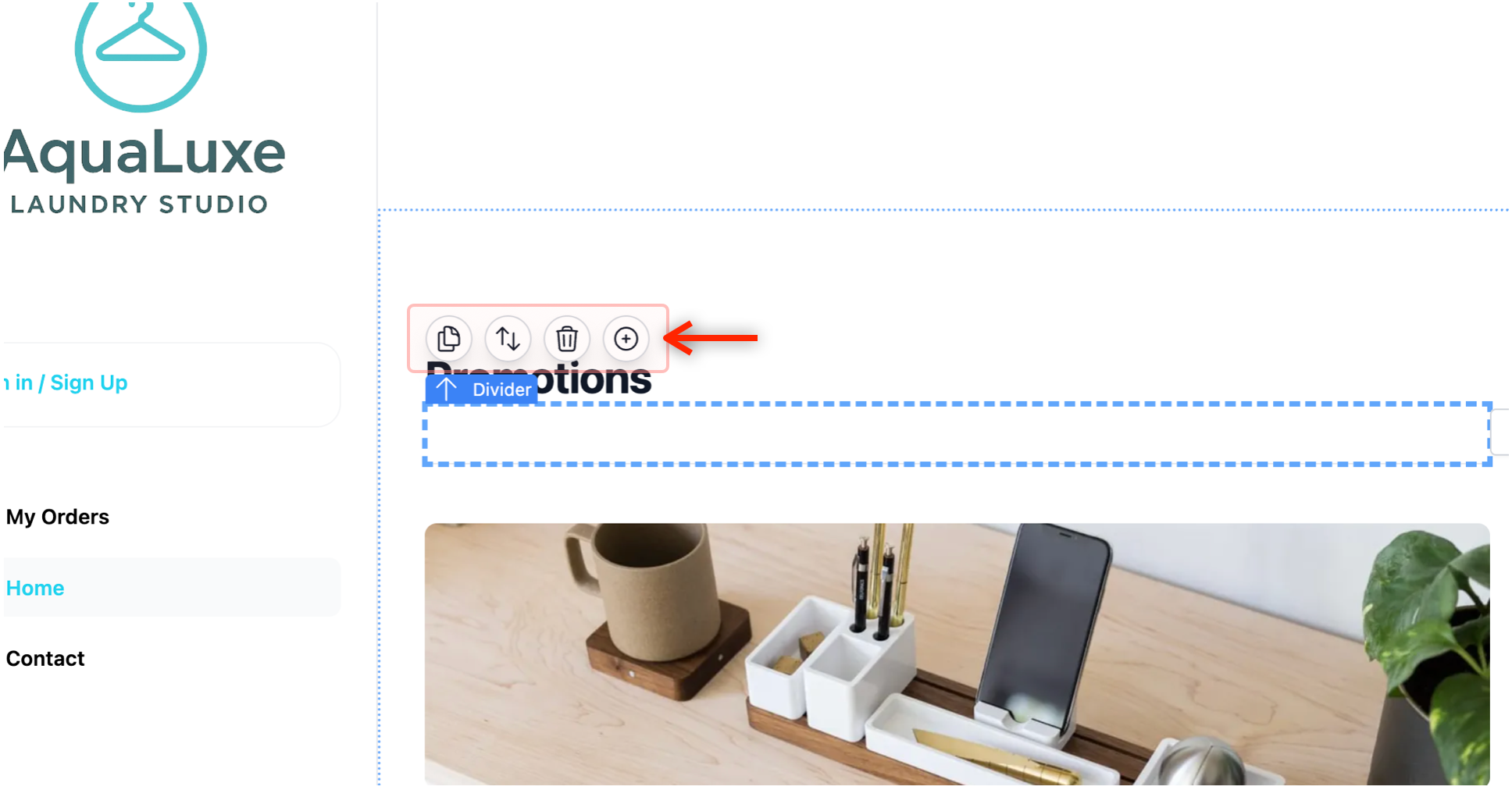 Once you have selected a block, you will notice a small bar of icons appearing directly above the item in the Website Preview. Think of this as your Shortcuts Bar.