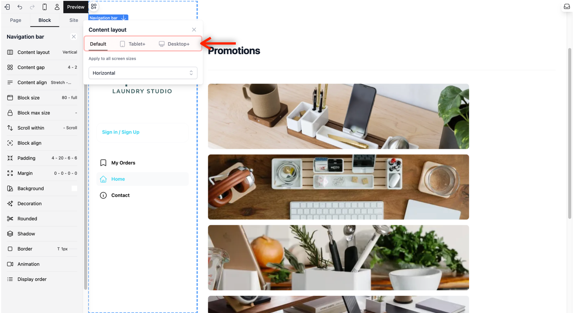 The Rule of Thumb: Always start your design in the Default tab. If you want a specific look for larger screens only—like having a "Horizontal" layout on a computer but a "Vertical" list on a tablet and phone—you would need to adjust the Default and Tablet tabs to be vertical while the Desktop tab is a horizontal layout. The system will handle the switch automatically based on what device your customer is using.