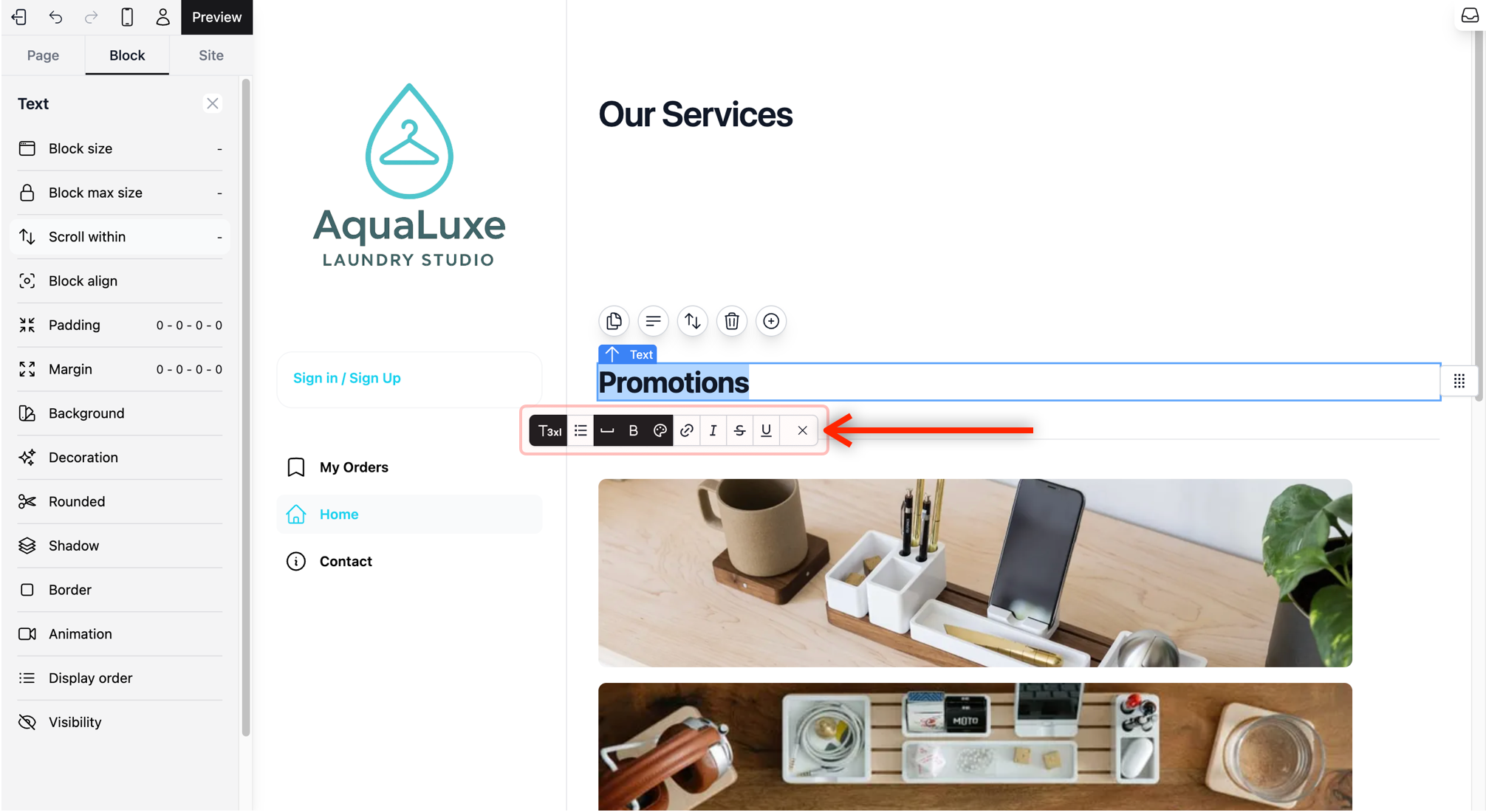The Block Tab is where you customize the specific elements of your website. Similar to how you would format a slide in PowerPoint, this tab allows you to adjust font styles, change colors, swap images, and control the layout of individual pieces of content.