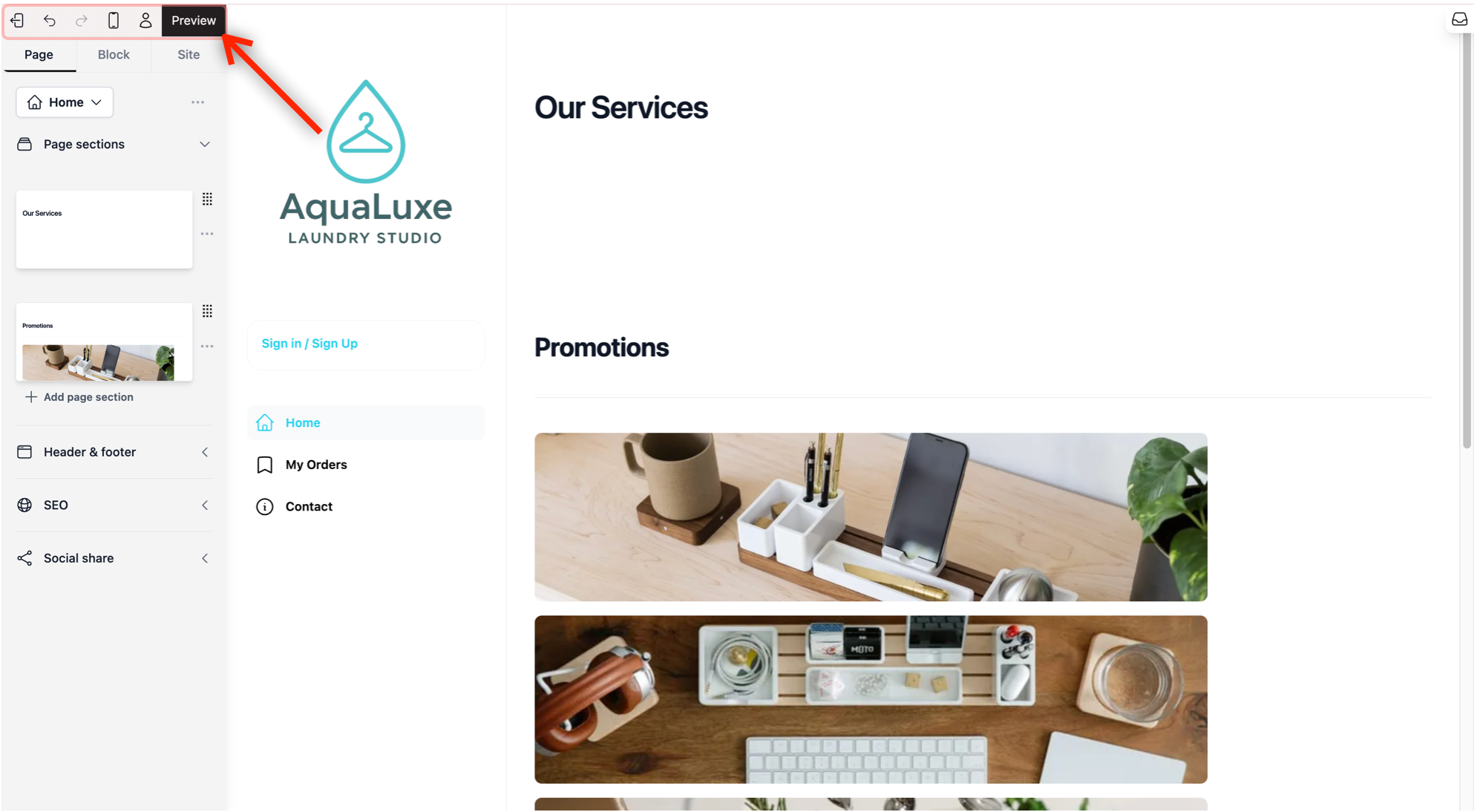 - Mobile View: Most customers will view your site on their phones. Click this to see how your design looks on a mobile screen. To go back to the computer view, simply click the icon again.