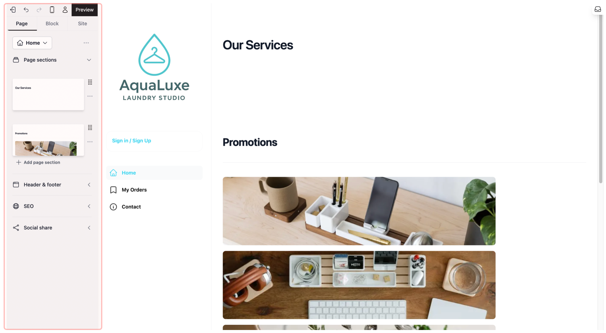 - The Sidebar (Left Side): Think of this like the Insert & Format panel in PowerPoint. This is where you find new text boxes, change colors, or add pages. It is organized into three tabs: Site, Page, and Block.