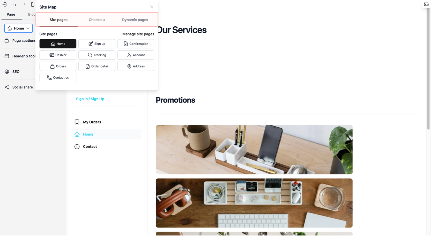 The Page Tab is where you build the structure of your website. It allows you to switch between different pages, enable access to your checkout and pricing views, and organize the physical layout of each page using sections.