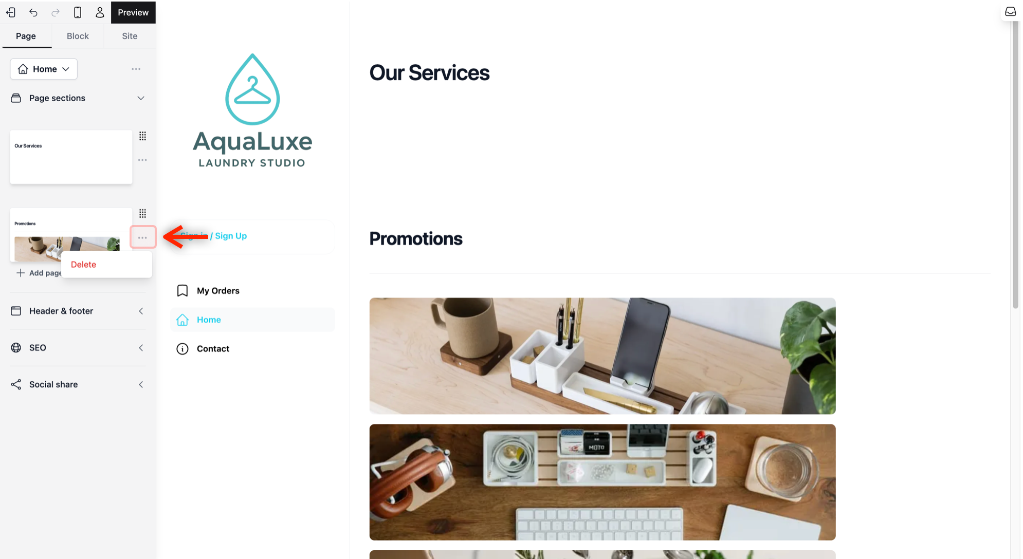 If you find that a section no longer fits your website’s needs, you can remove it in just two clicks: