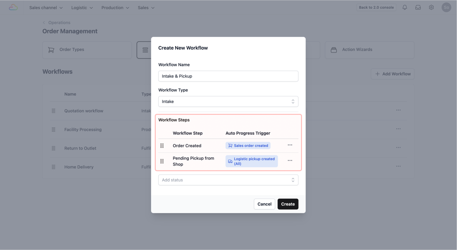 - Auto Progress Trigger: A popup will appear when a status is selected. In the dropdown menu, select the event that will trigger the progress. This is the specific action taken by a worker that automatically moves the sales order to the next step in the process.
