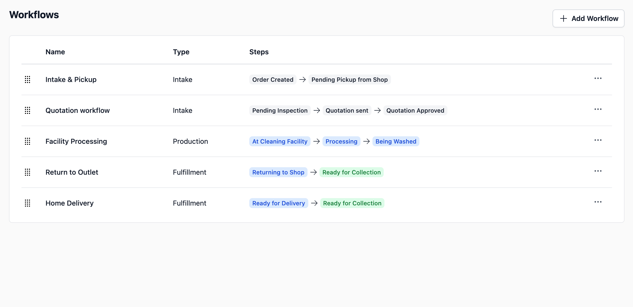 A workflow is a collection of steps (from your Status Library) designed for specific use cases. For example, you might have an "Intake & Pickup" workflow or a "Quotation" workflow. Each workflow is tied to a Workflow Type (like Intake, Production, or Fulfillment), allowing you to group specific tasks into organized stages. Learn more about Workflows here →