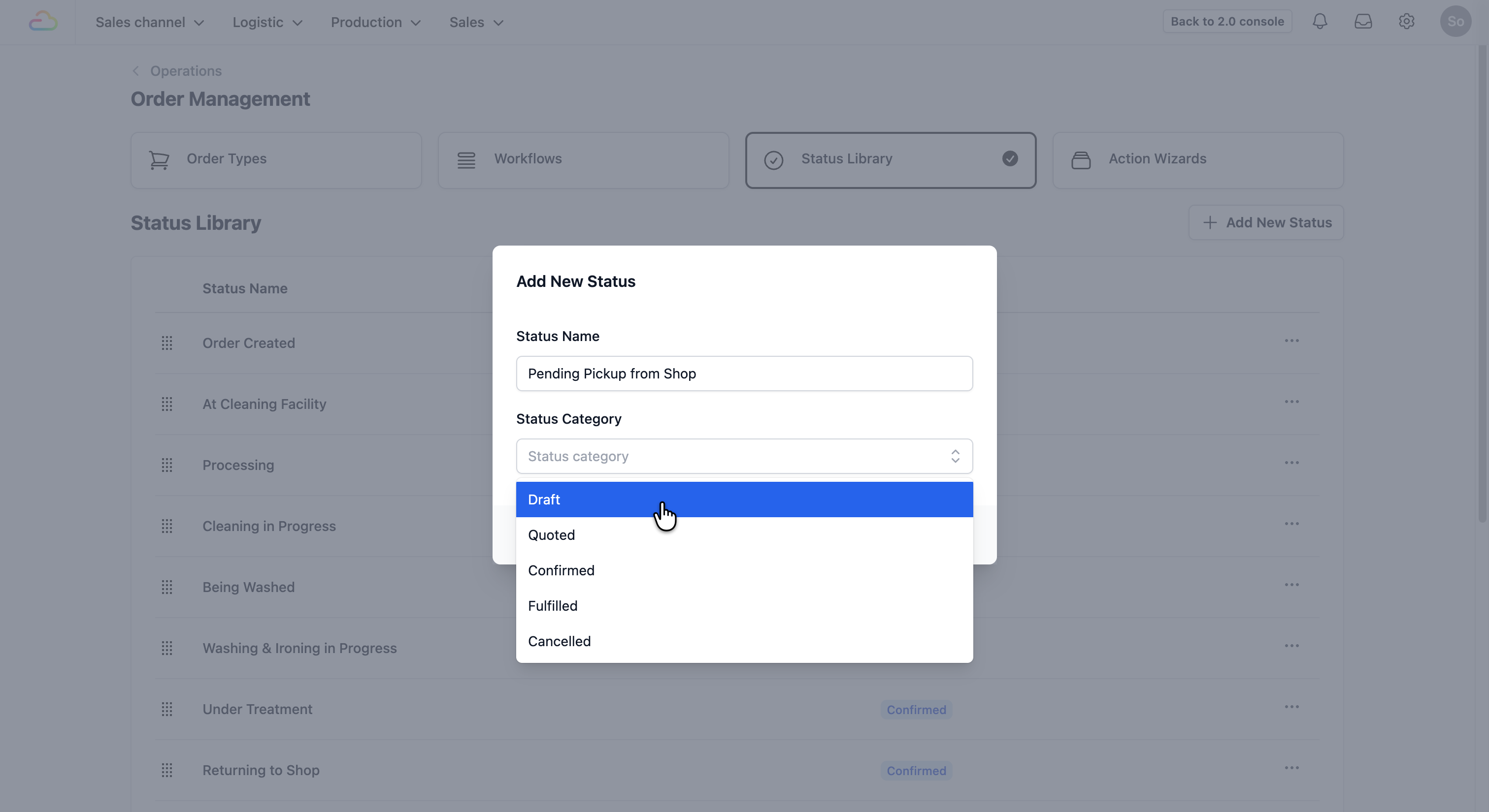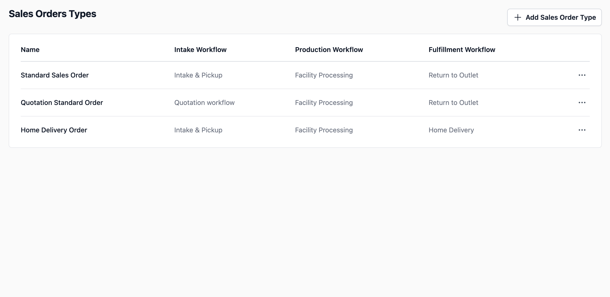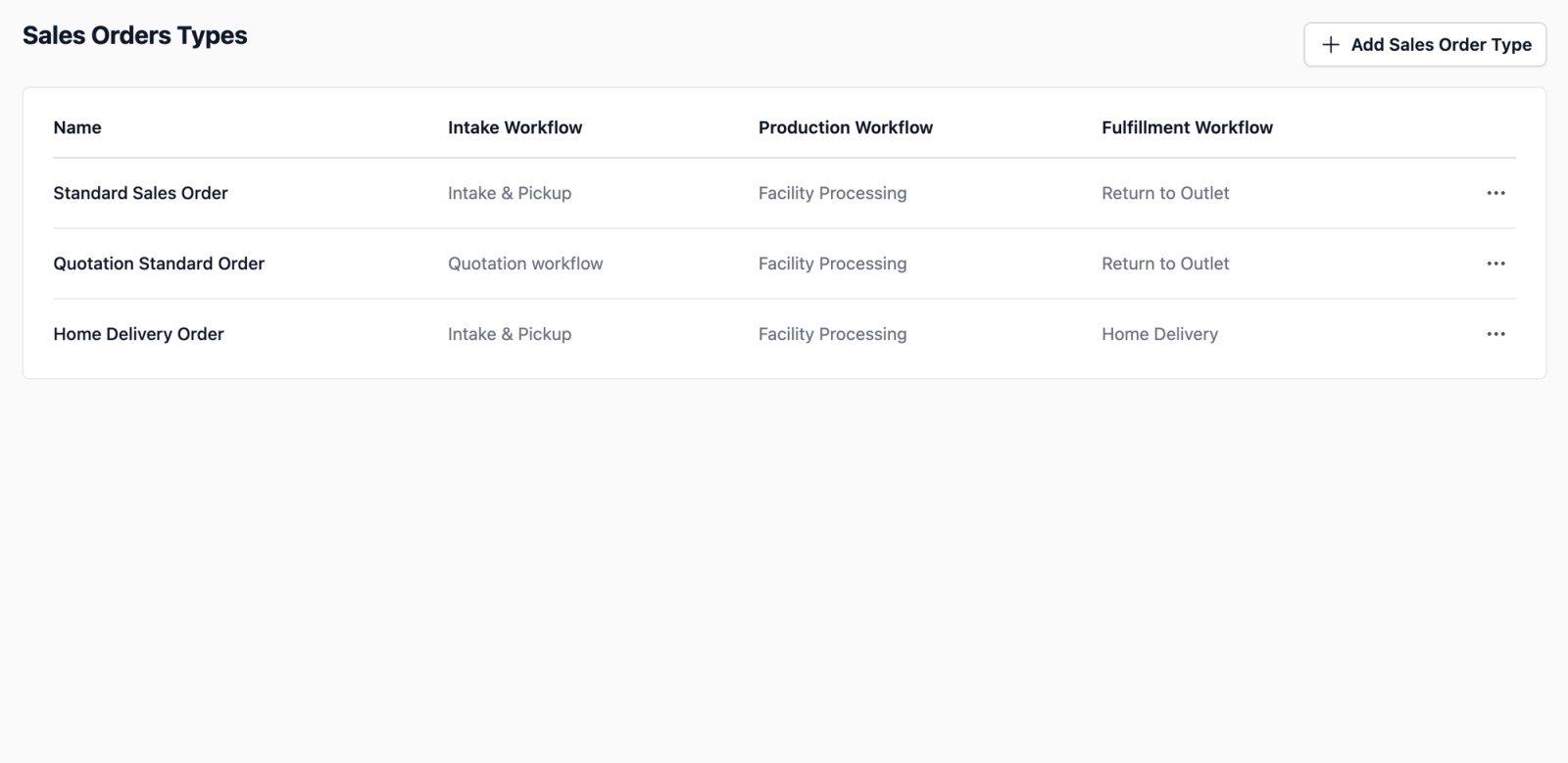 This is where you link your workflows together to create a complete end-to-end process. For a typical sales order, the workflow will look like this: Intake → Production → Fulfillment . This ensures that when a certain type of order is created, the system knows exactly which process the order is currently is.