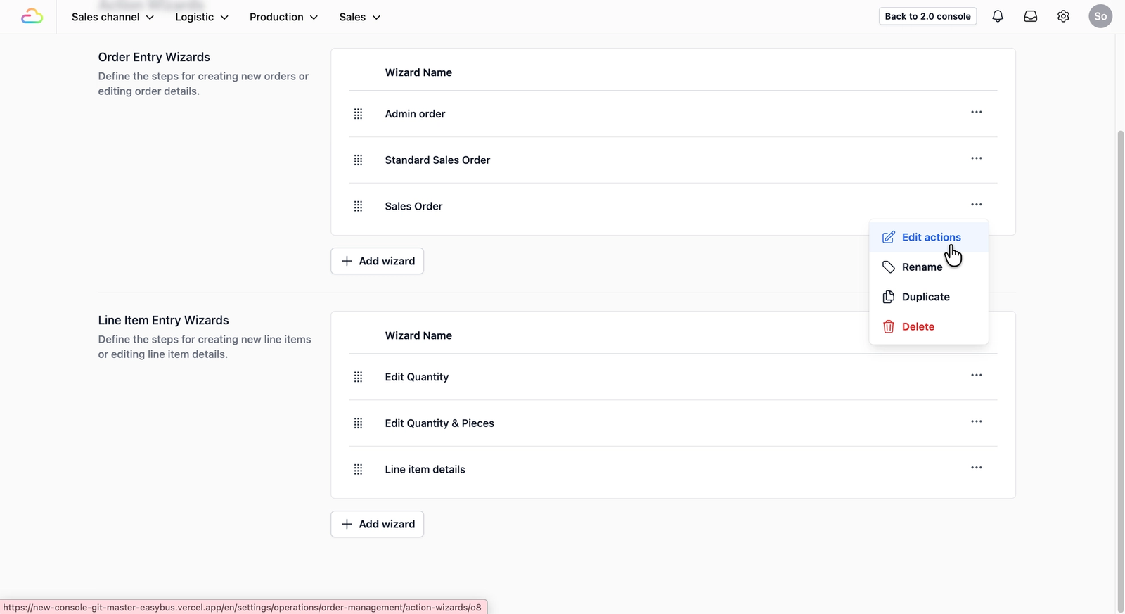 - Click on the β’β’β’ on the far right of the order entry that you want to define the actions to and select Edit Actions.