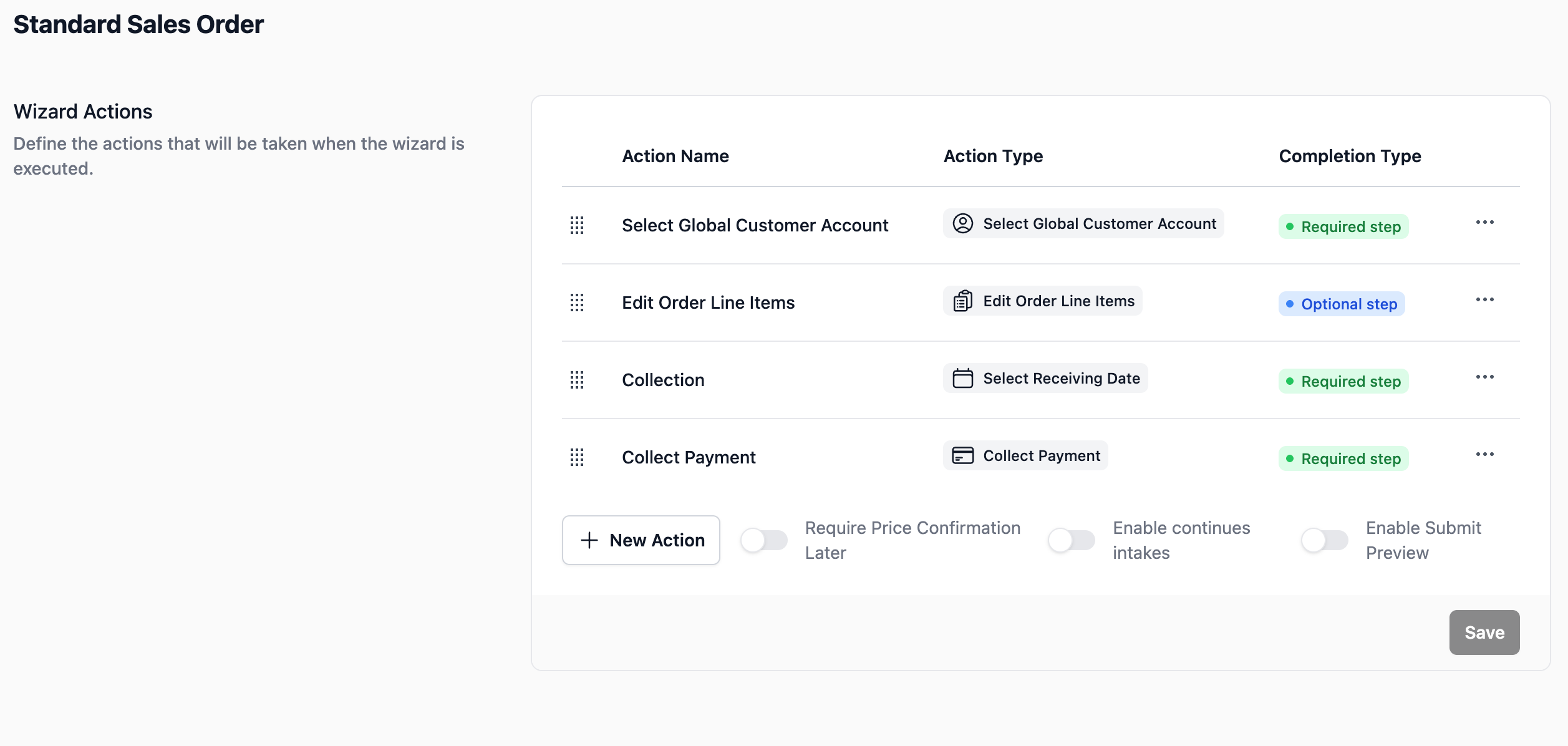 Define the step-by-step procedure your team follows to create an order. In the system, these procedures are called Action Wizards.