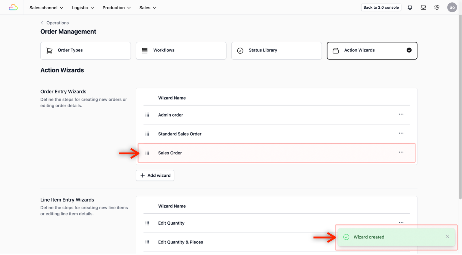 The pop-up will close and you will see a notification confirming the successful creation on the bottom right of your screen. Your new order entry will now appear in the list under the Order Entry Wizards section.