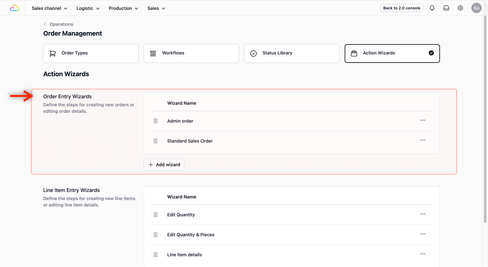 Locate the Order Entry Wizards section. This is where you define the Sales Order name and the order procedures.