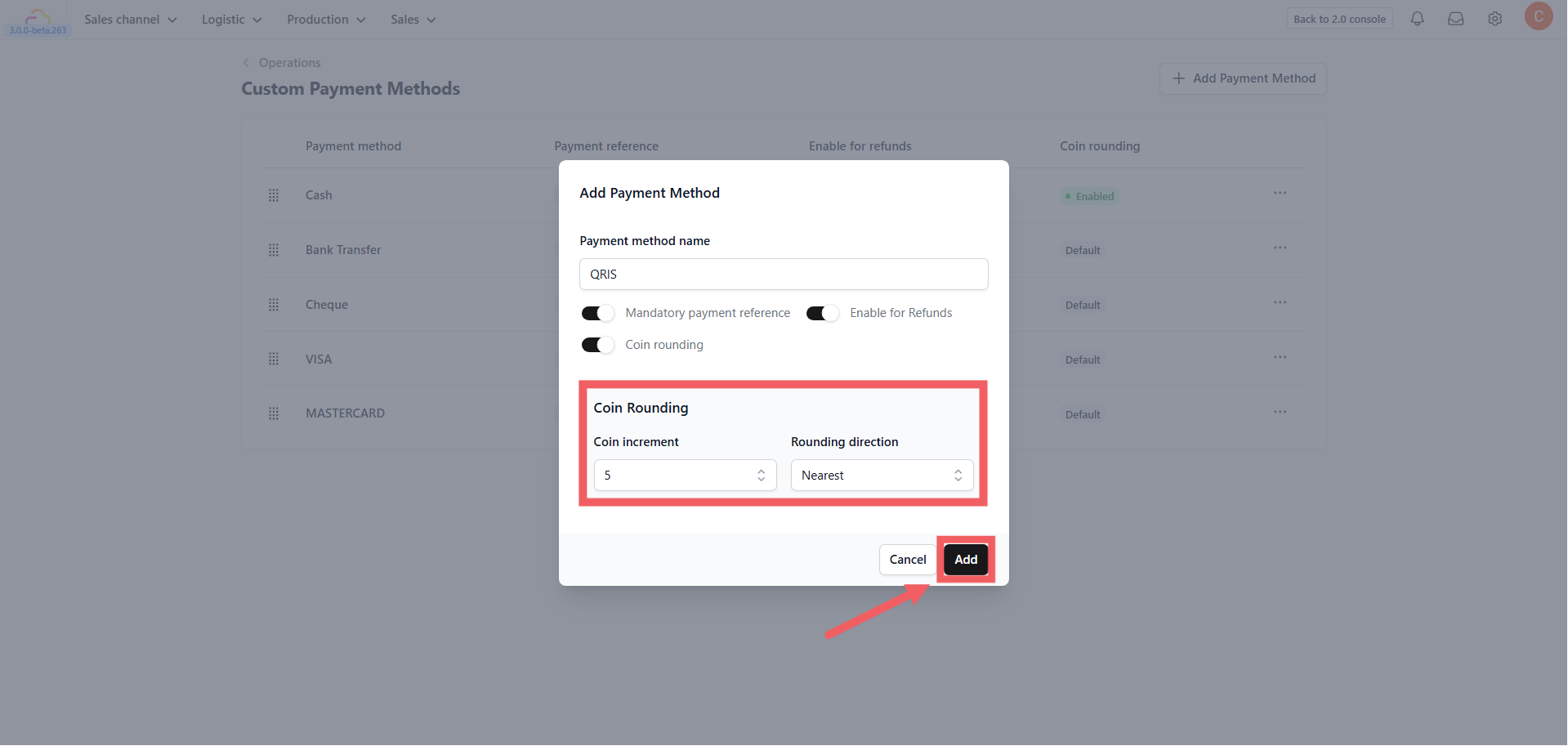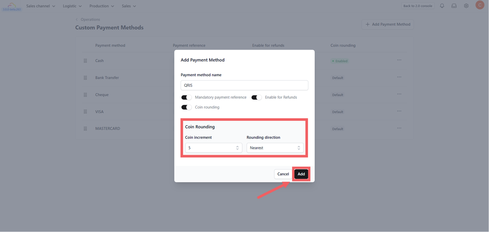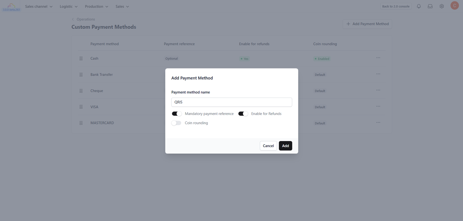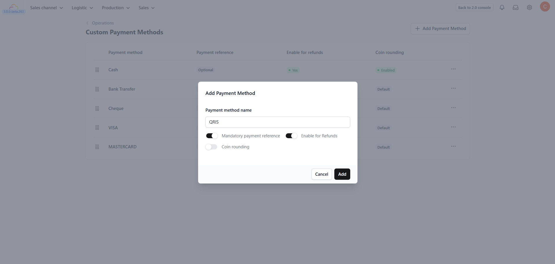- Payment method name: Enter the name (e.g., "Cash", "QRIS").