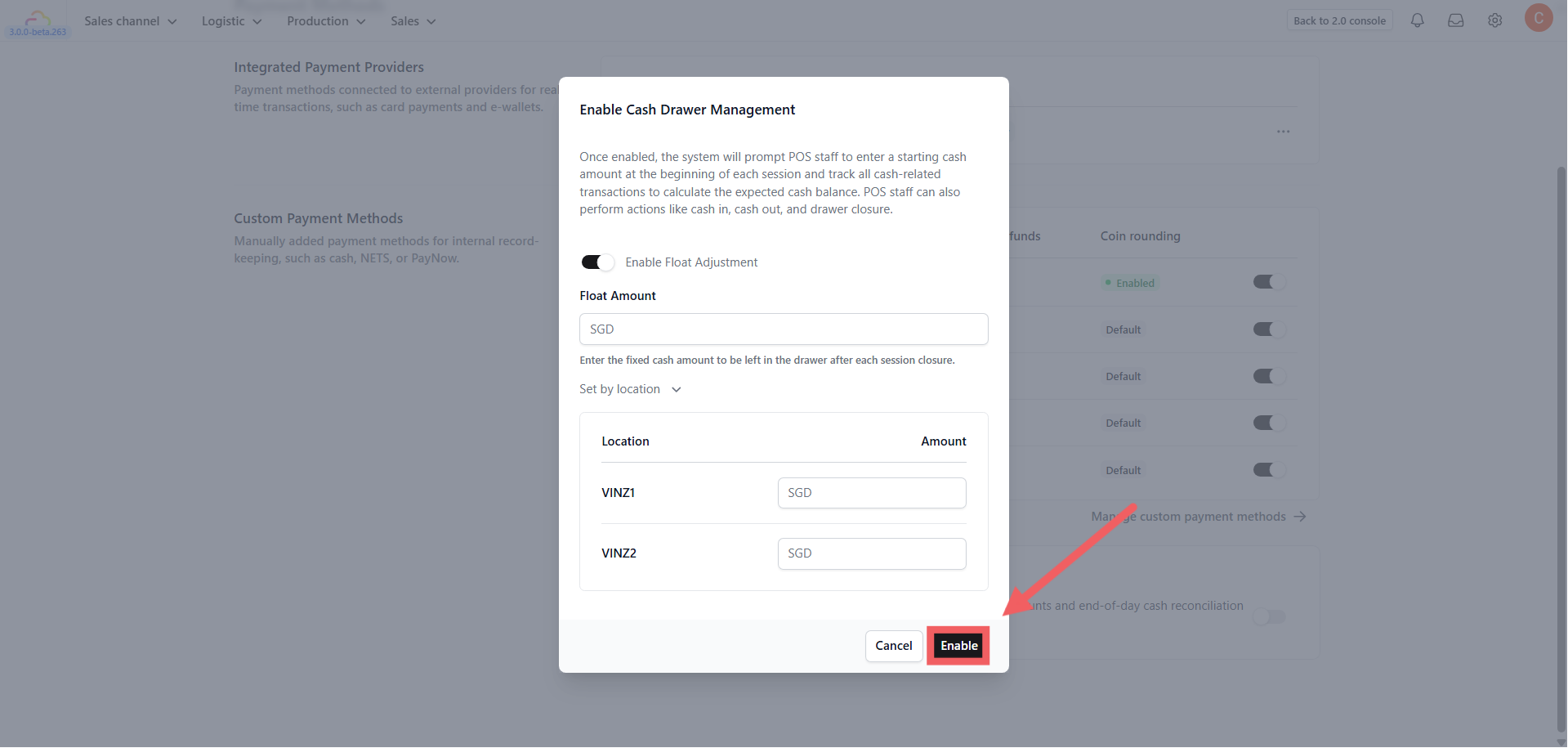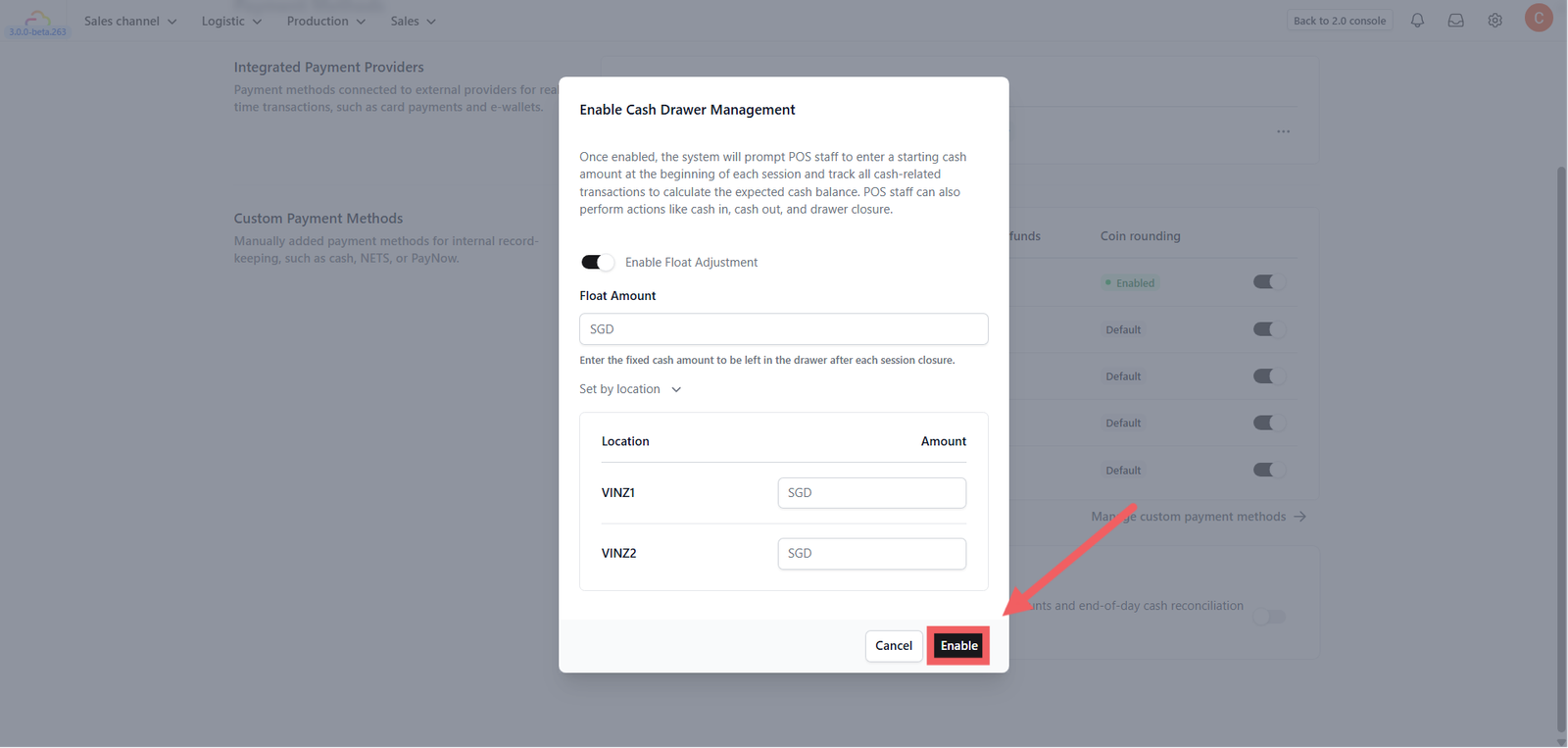 - Enable Float Adjustment: Toggle this ON if you want the system to automatically reset the cash balance to a fixed deposit amount whenever the drawer is closed.
