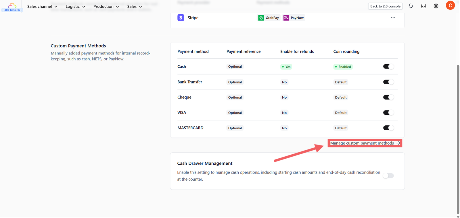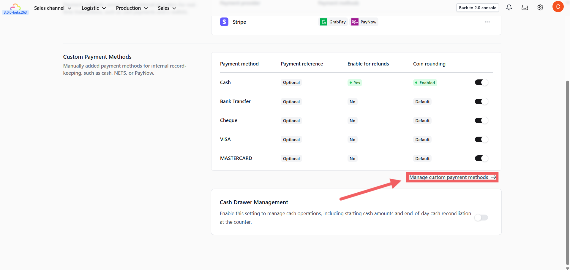 3. Under "Custom Payment Methods", click Manage custom payment methods.