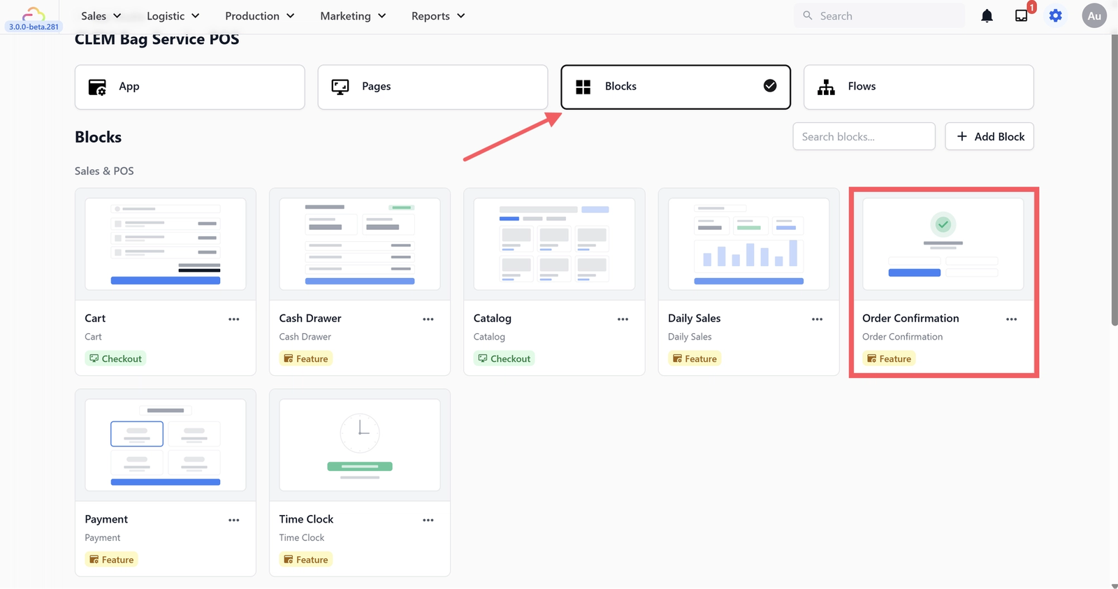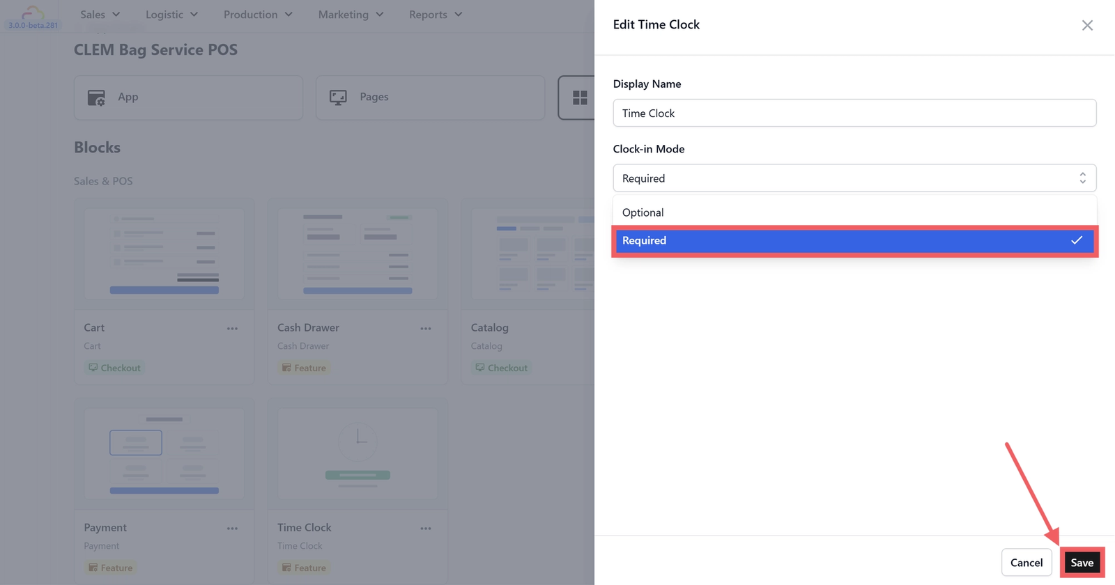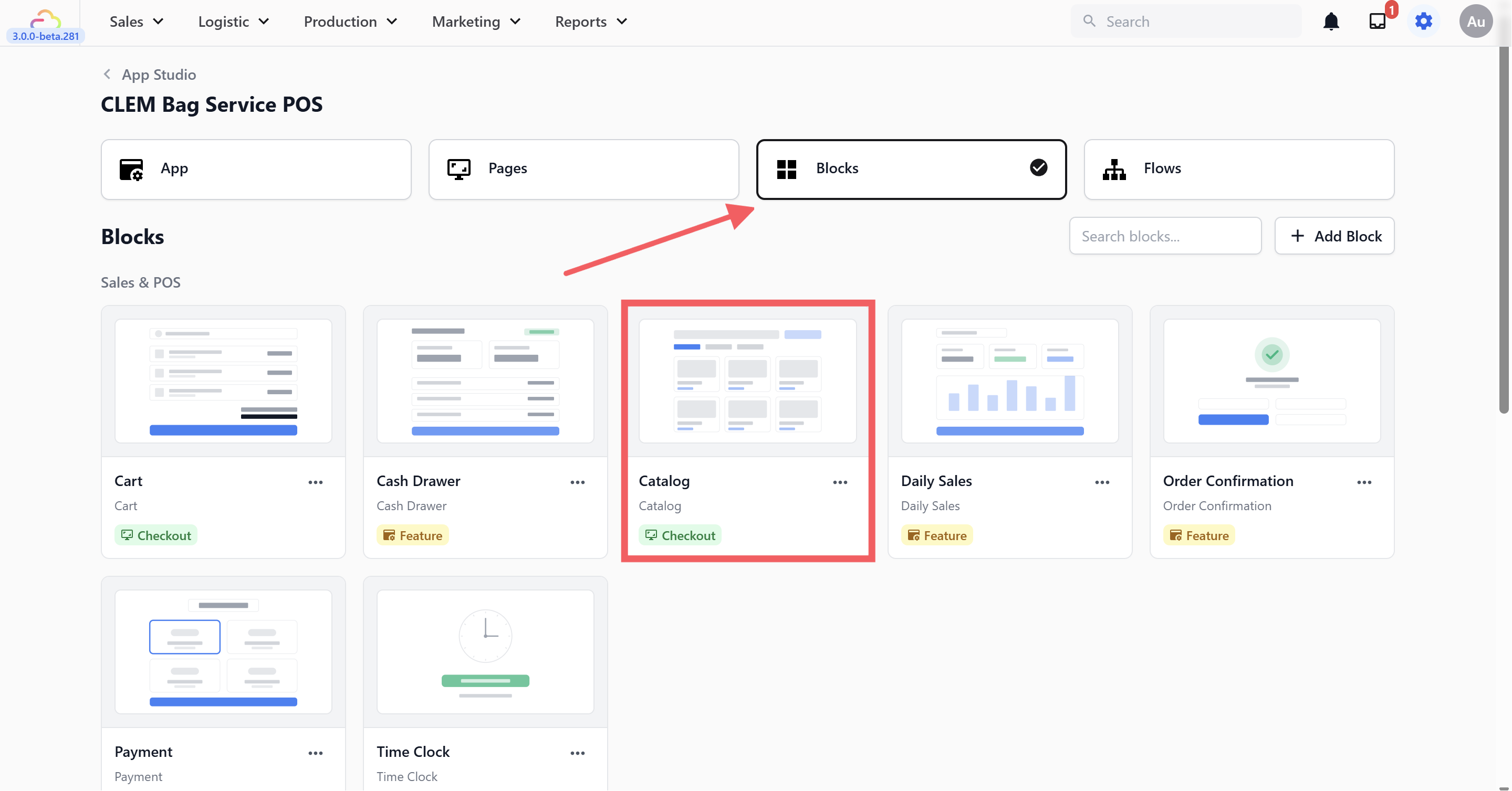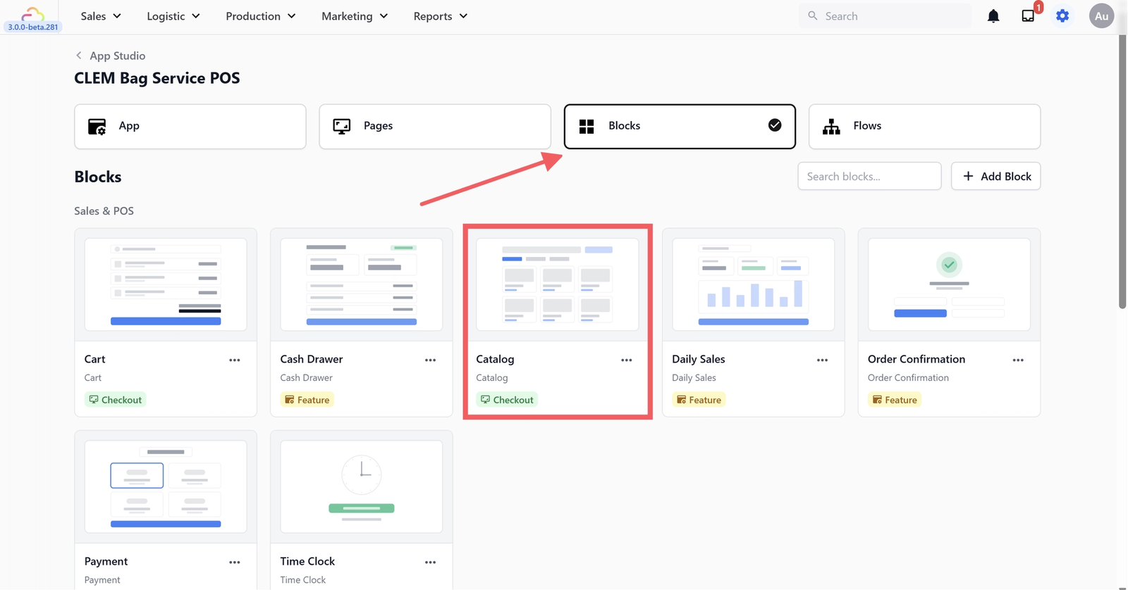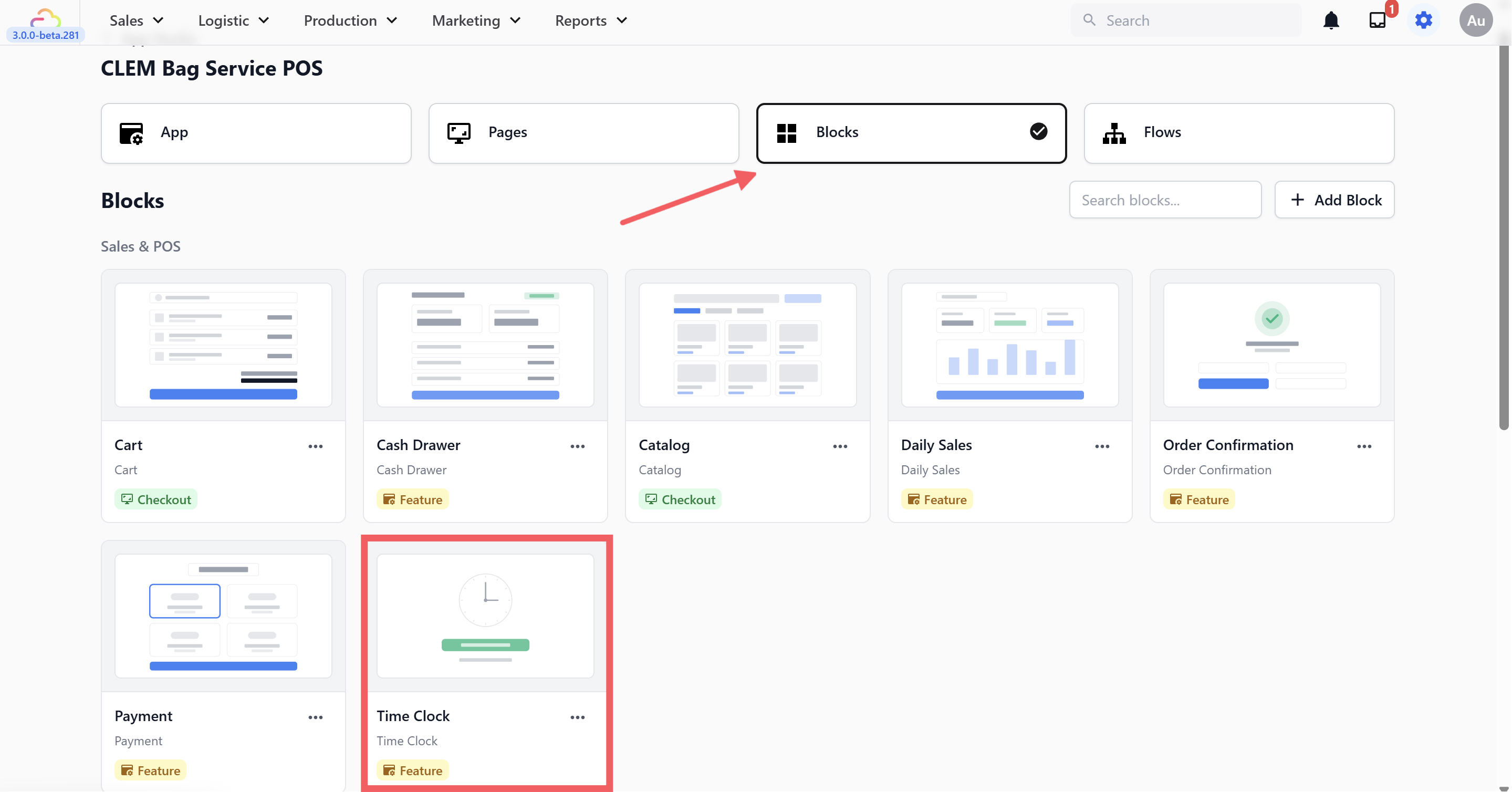 If you want to make clocking in mandatory before staff can start taking orders, go to the Blocks tab in App Studio and click on the Time Clock block.