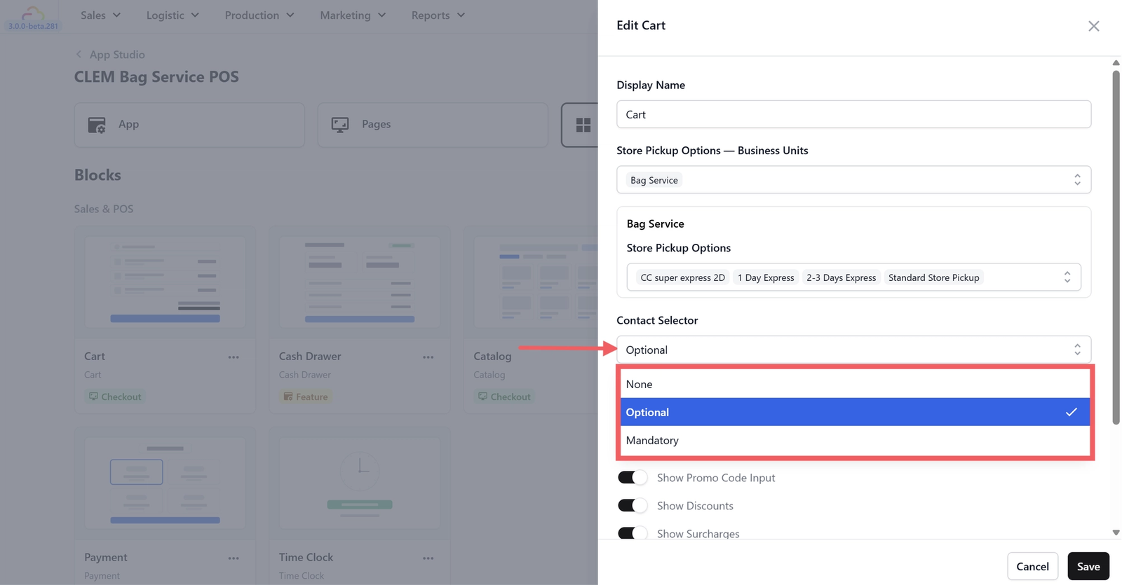 - Contact Selector: This controls whether your staff needs to assign a customer to each order. It defaults to Optional. For bag repair businesses, we recommend changing this to Mandatory since every bag in your shop needs to be traceable to a specific customer, especially when you have multiple bags from different customers in the shop at the same time.