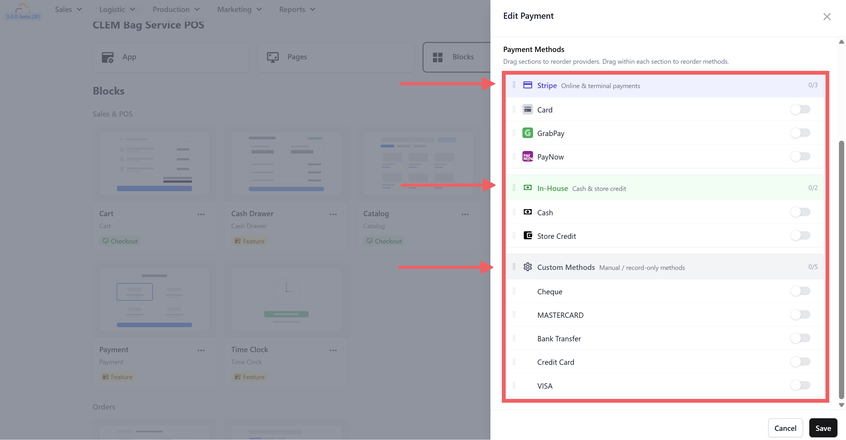You can drag and reorder the methods the order you set here is the order your staff will see them during checkout.