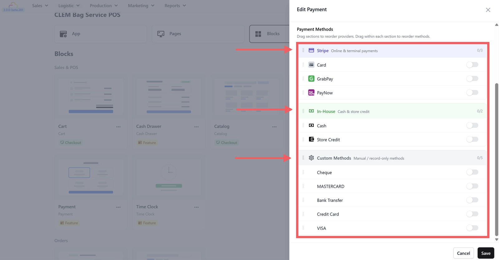The Payment block controls which payment methods your staff can accept when checking out an order. You need to turn on the ones your shop uses so they appear as options during checkout.