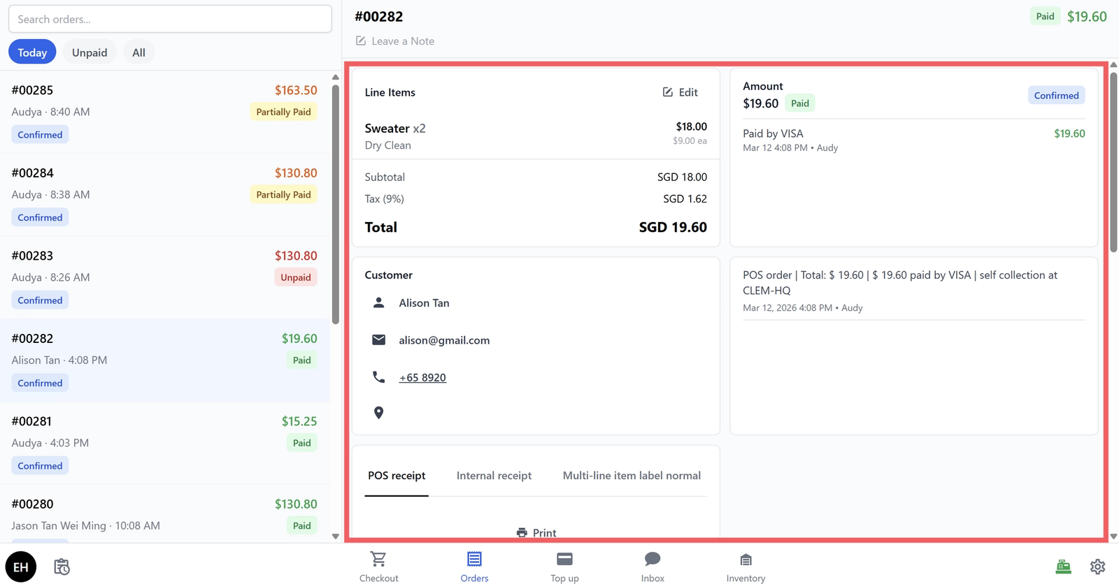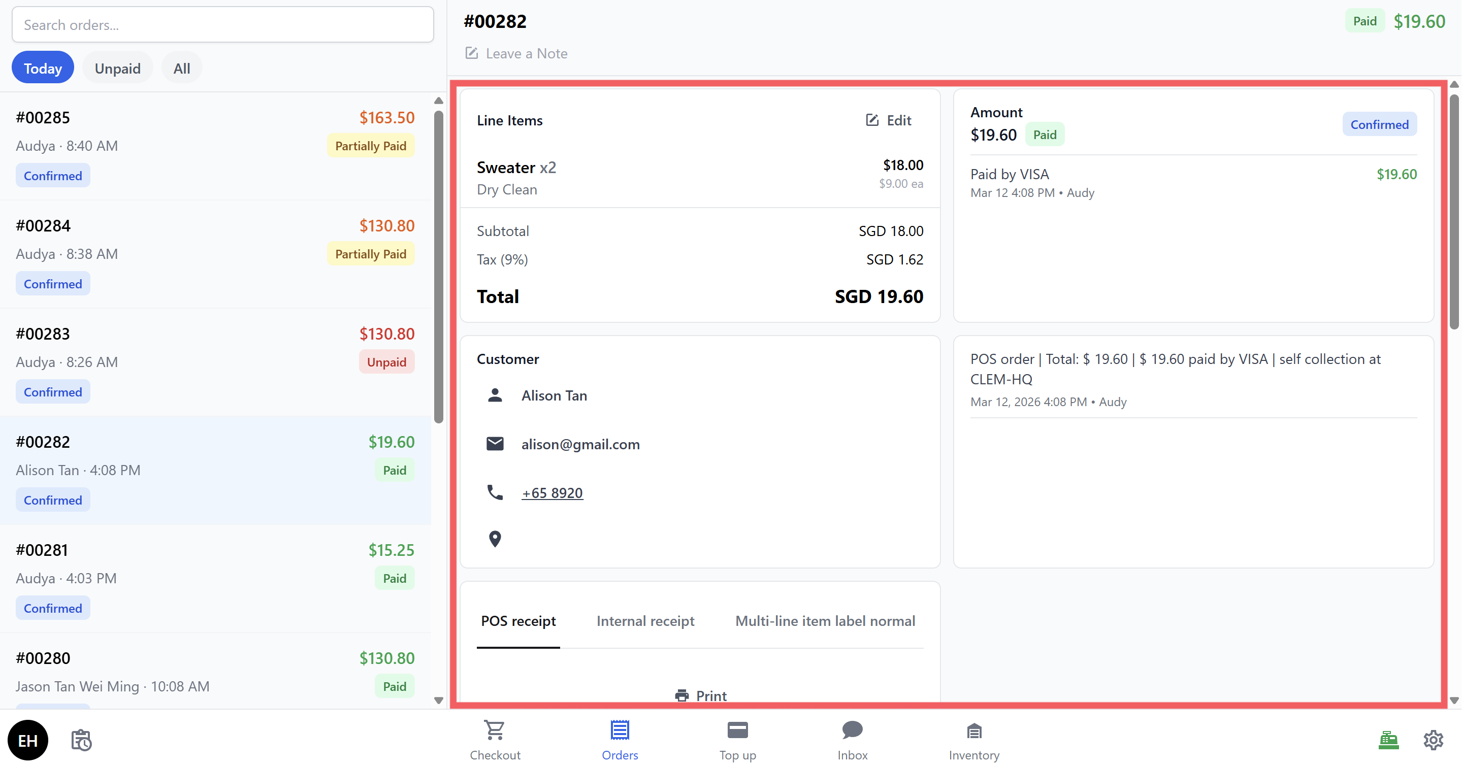 - Orders: View all orders. Tap any order to see its details, attach photos of the bag, print labels or receipts, and check payment status. Filter by Today, Unpaid, or All.