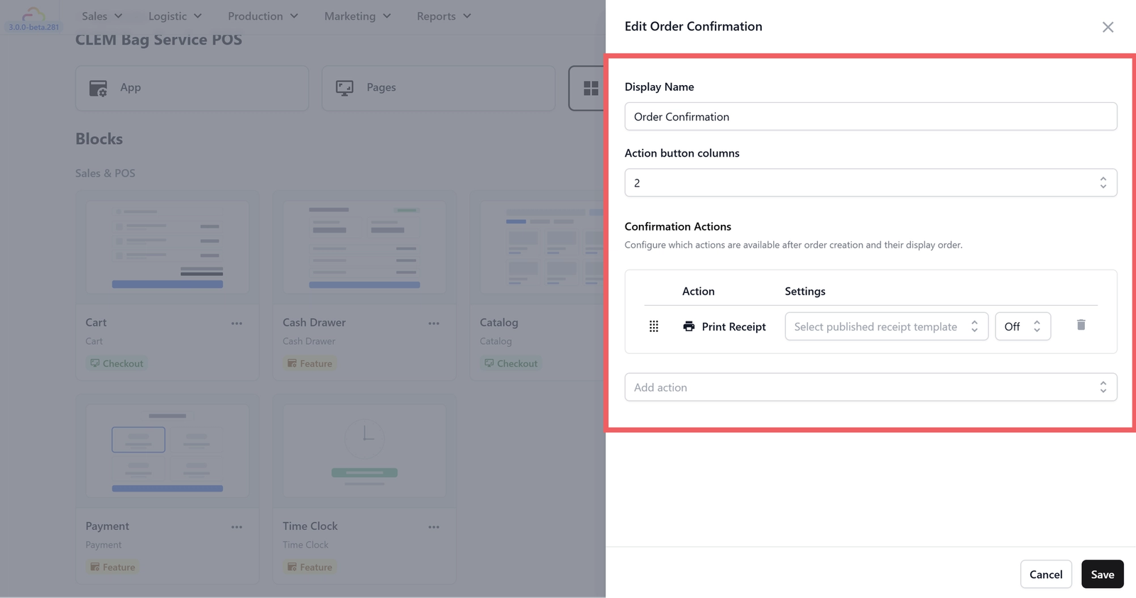 - Confirmation Actions: Click the Add action dropdown to choose which actions your staff can take right after an order is created.