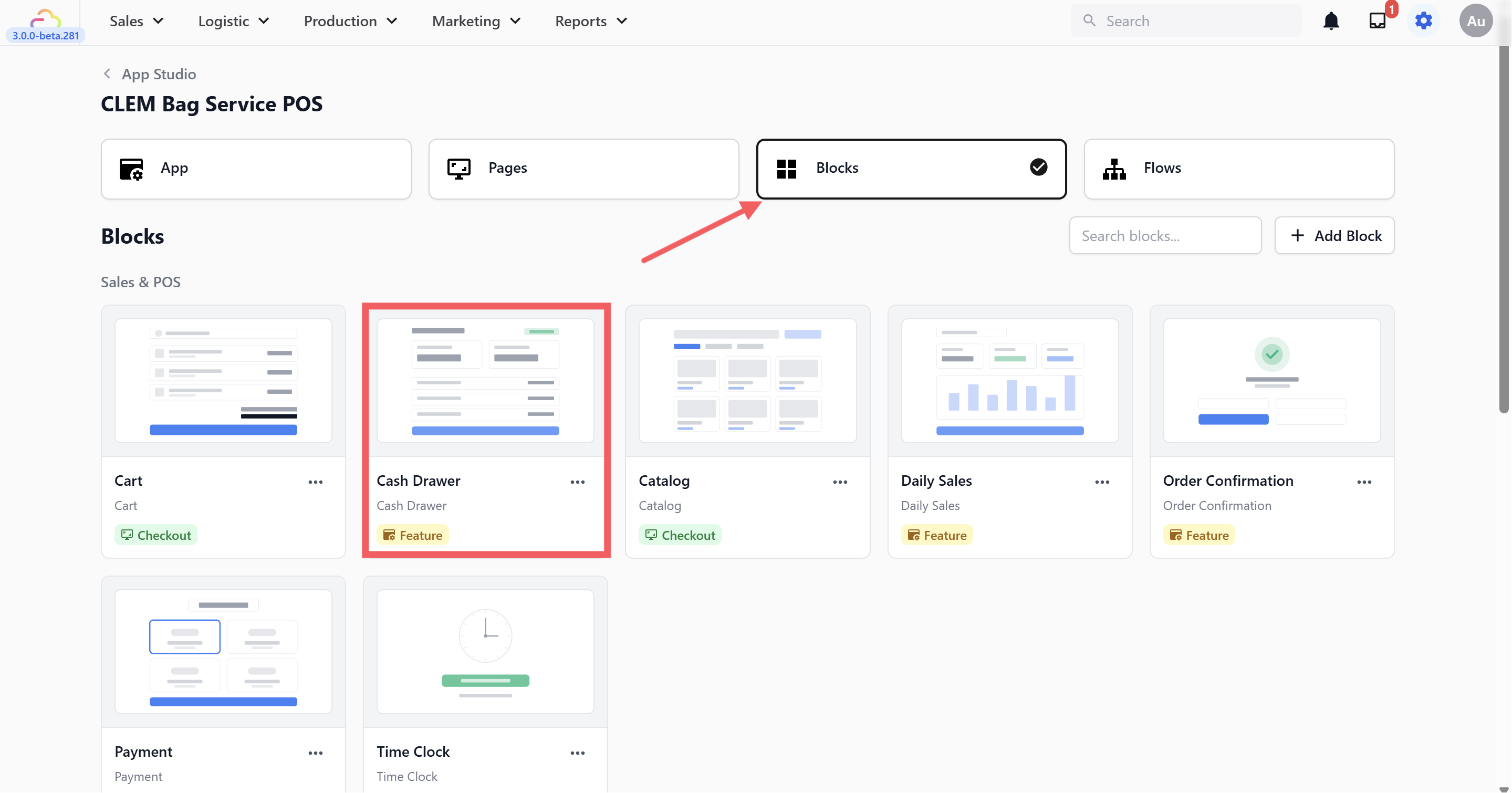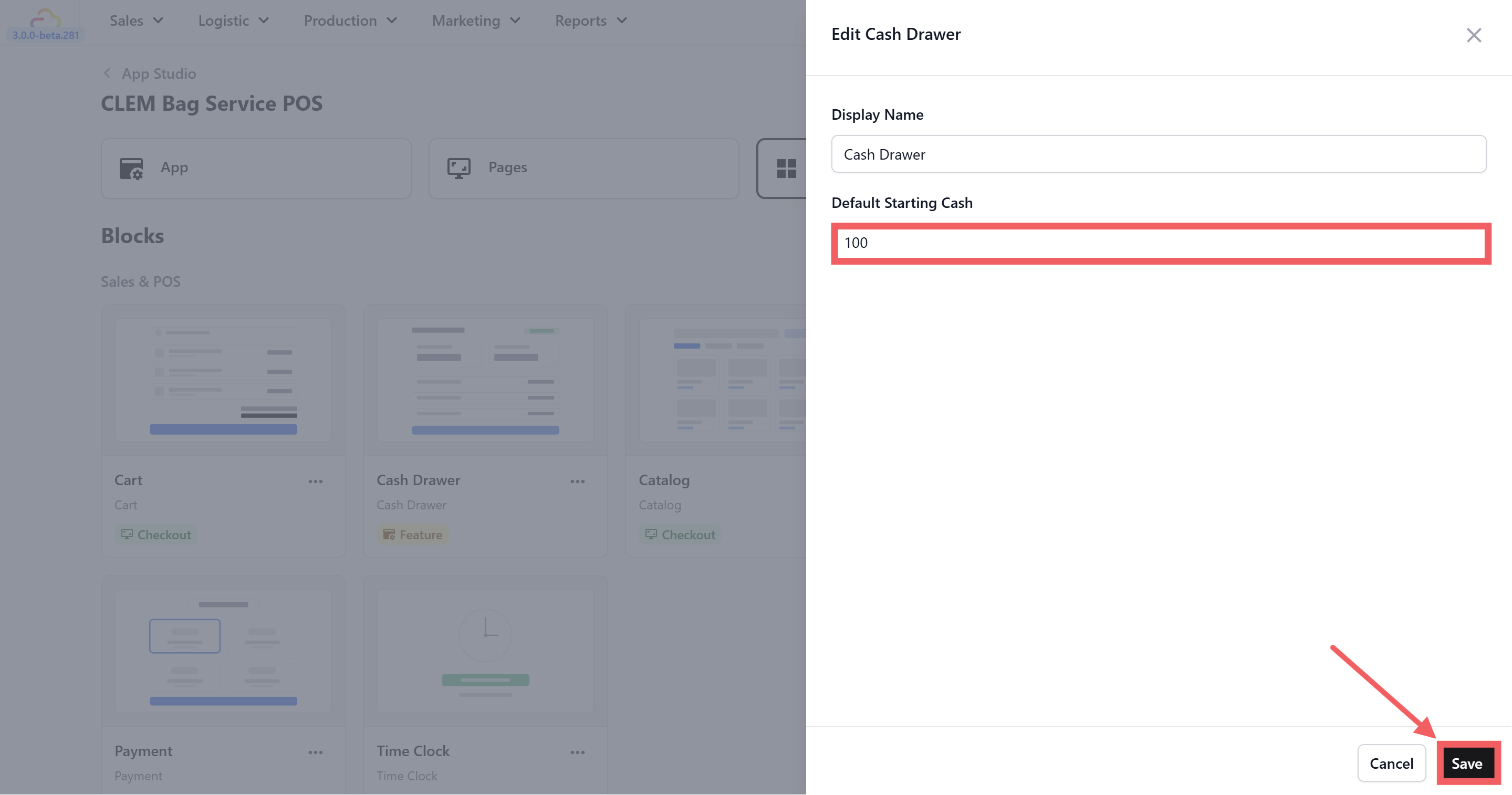 If you want to set a default starting cash amount so your staff does not have to type it in every day, go to the Blocks tab in App Studio and click on the Cash Drawer block.