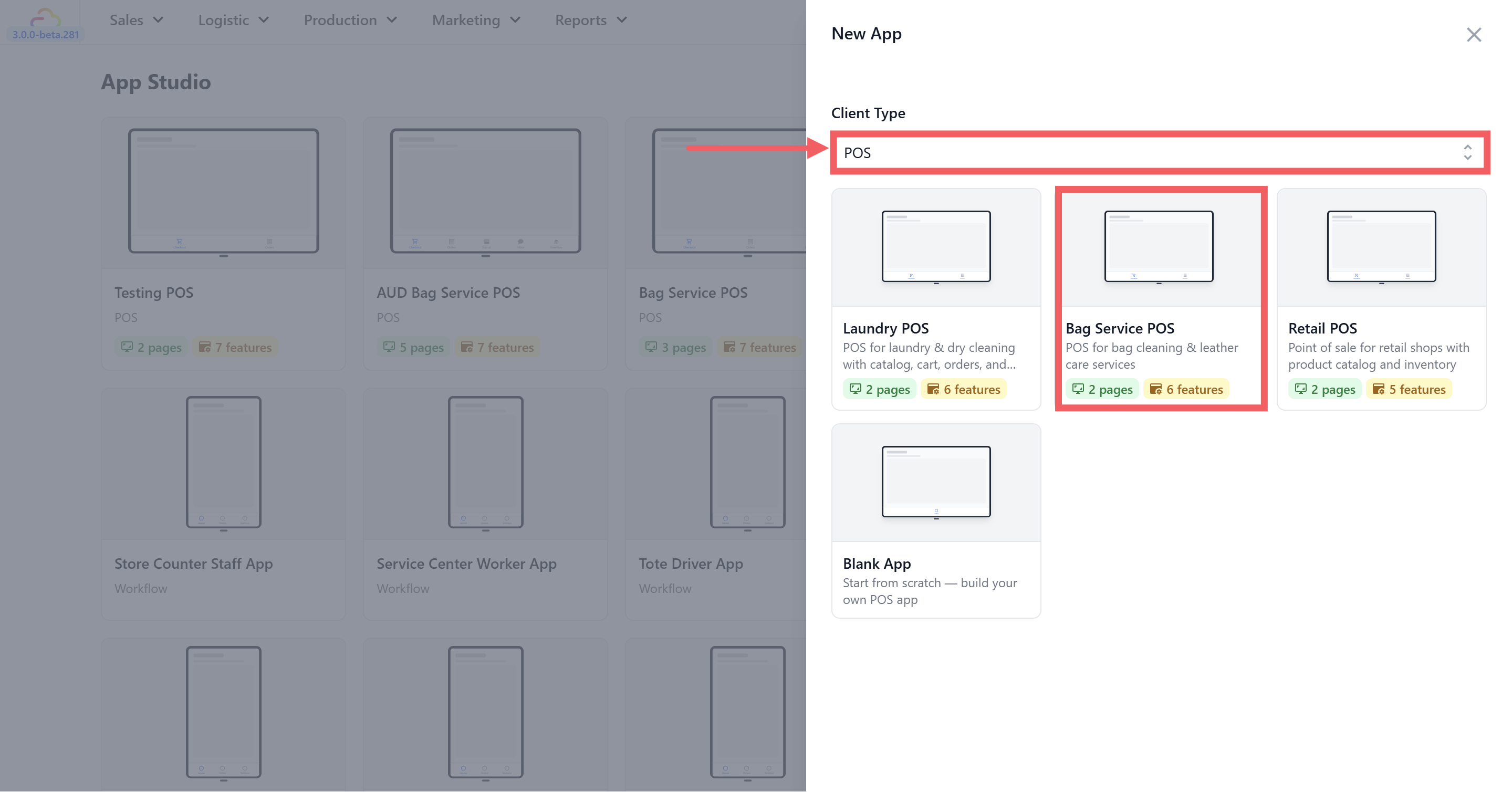 The first thing you need to do is create a new POS app in EasyBiz. There is a ready-made Bag Service POS template that does most of the work for you so you do not have to build anything from scratch. it comes with a checkout screen, order tracking, payment processing, and everything else already built in. You just need to connect it to your shop's services and products.