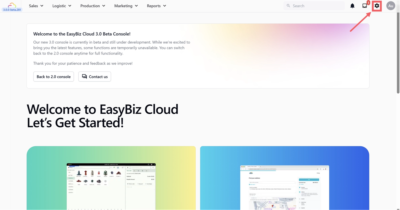 From the top navigation bar in your EasyBiz Console, click the Settings icon (the ⚙️ gear icon in the top right corner).
