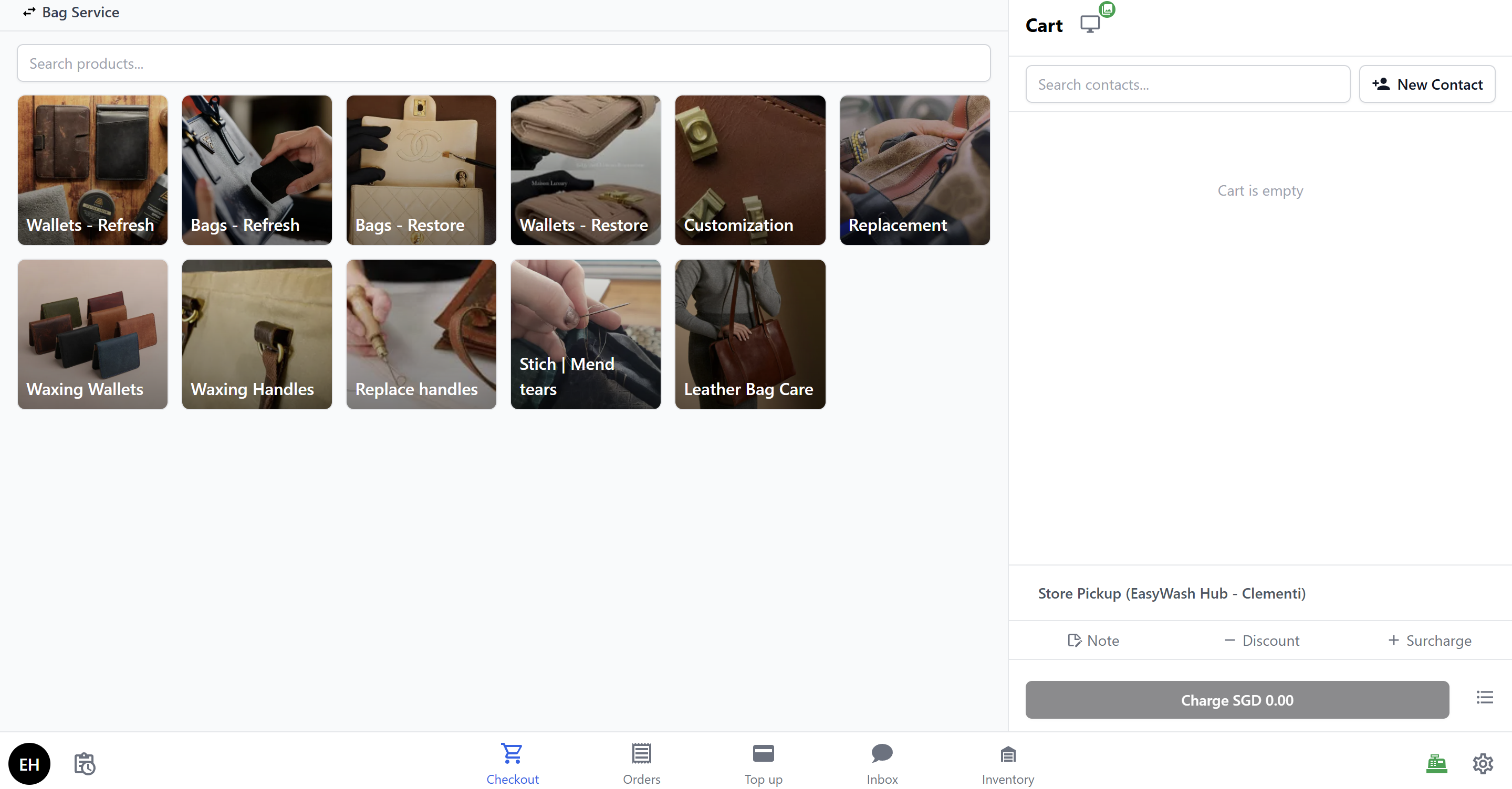 - Catalog: Shows your bag repair service items and retail products.