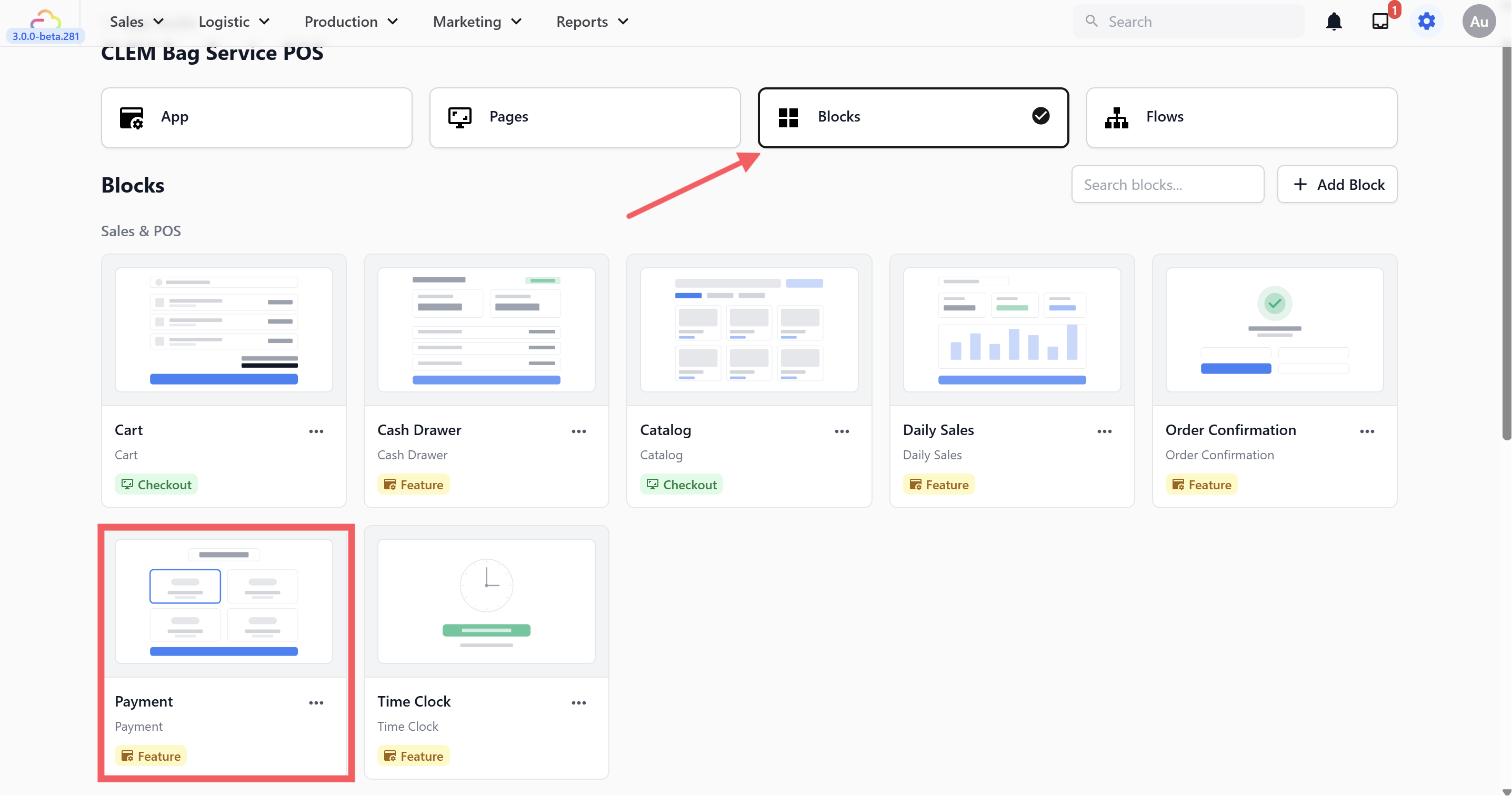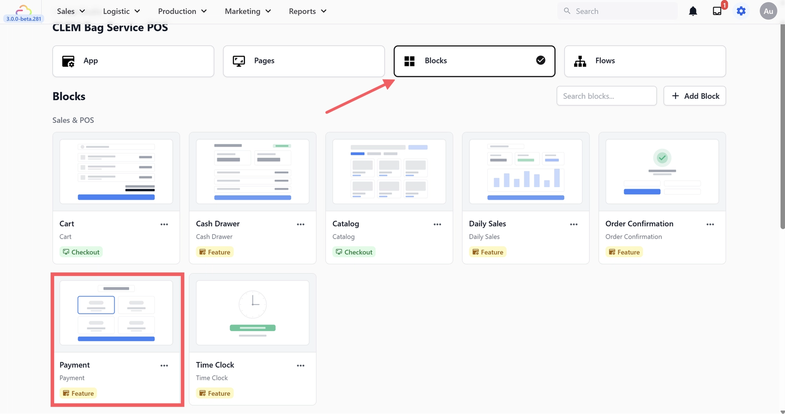 Go to the Blocks tab, find the block called Payment and click on it.