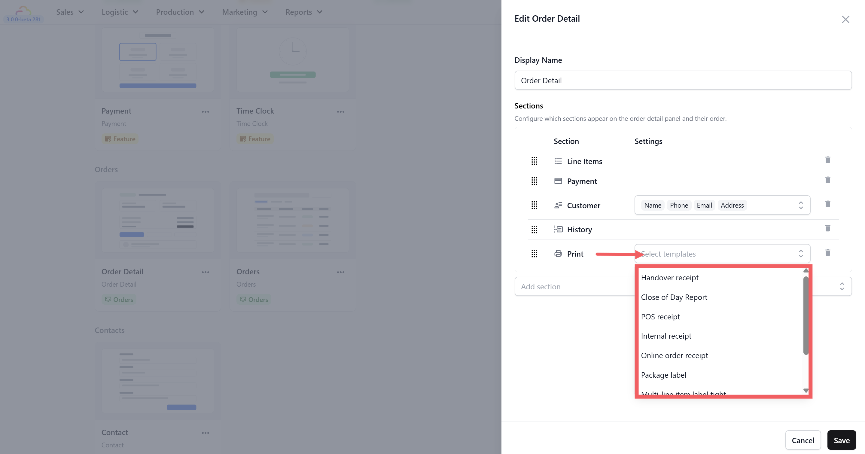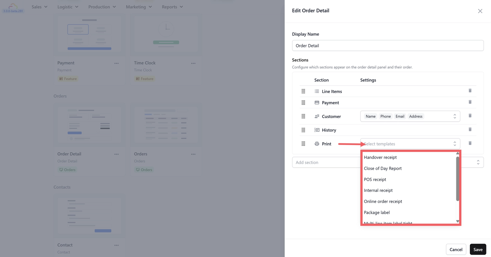 - When you add this section, you will need to select which templates to use from the dropdown (for example, "POS receipt" for receipts or "Package label" for item labels). Your console should already come with default templates to choose from.