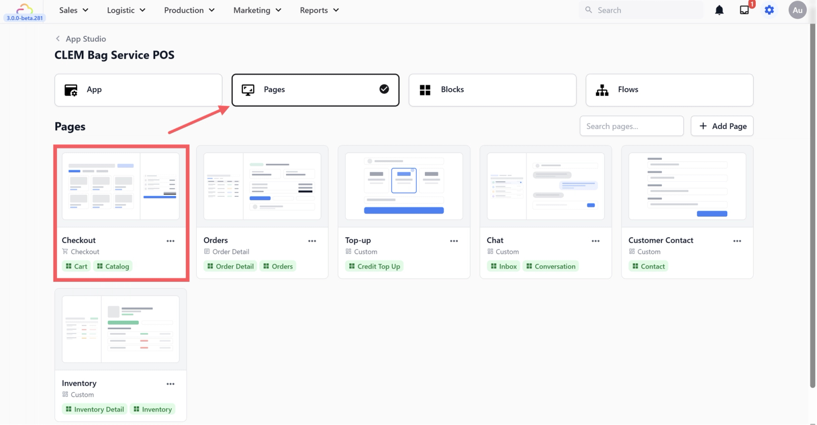 If you selected the Bag Service POS template at the start, your Catalog and Cart are already linked to the Checkout page. This step just confirms everything is connected correctly. You can verify this by going to the Pages tab and clicking on the Checkout page.