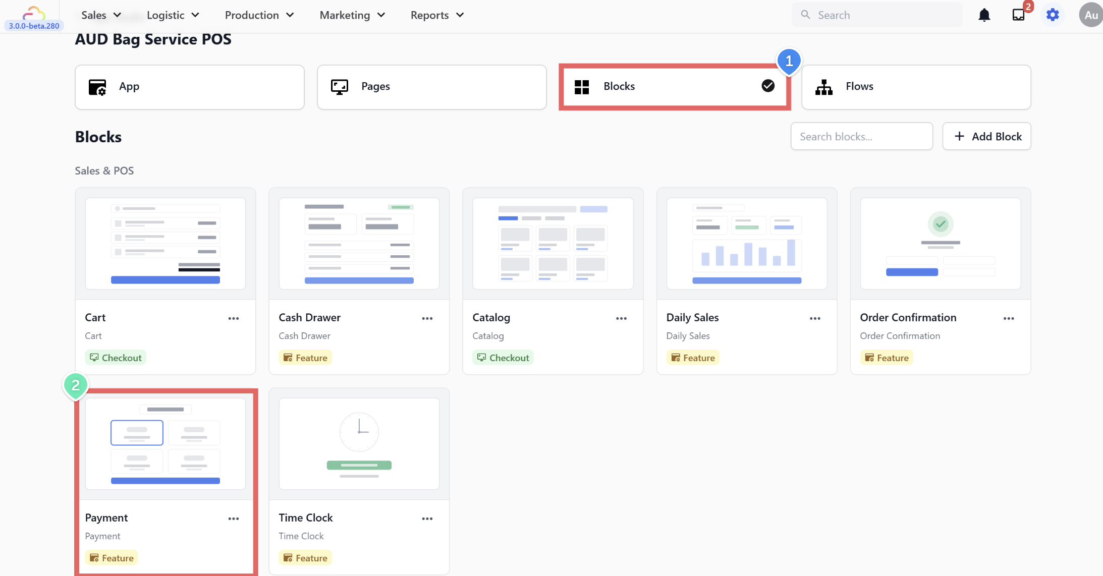 Go to the Blocks tab. Find the block called Payment and click on it.
