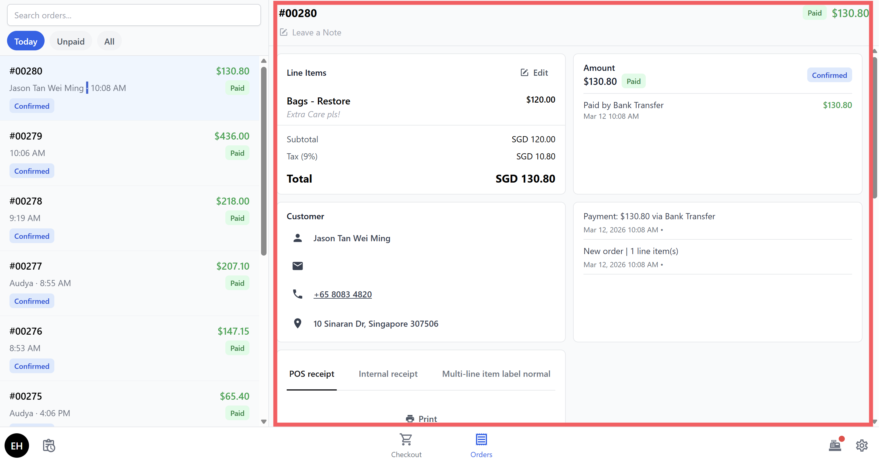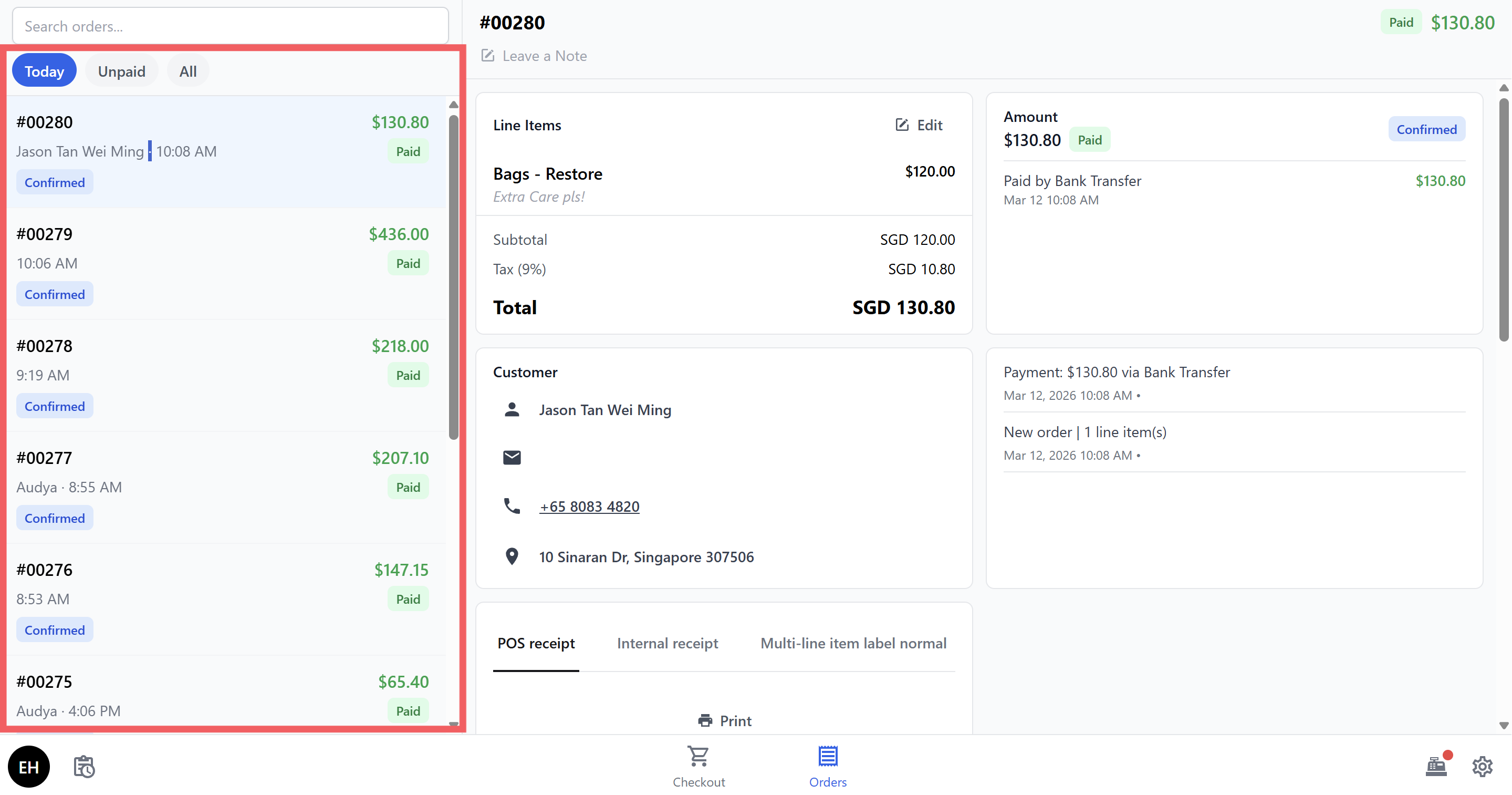 - Orders tab — View all your orders. Tap any order to see its details, print receipts or labels, attach photos, or check payment history. Filter by Today, Unpaid, or All.