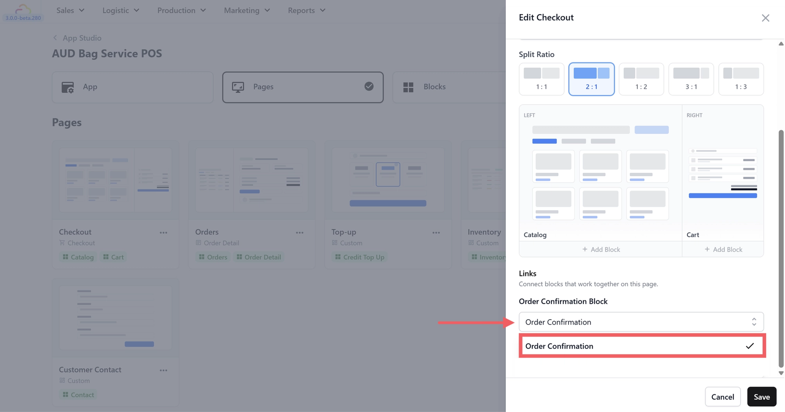 You should see a split layout with a 2:1 ratio — the left side (the larger panel) should be linked to your Catalog block and the right side should be linked to your Cart block. If the template has already set this up for you, you do not need to change anything. If not, select the correct block for each side.