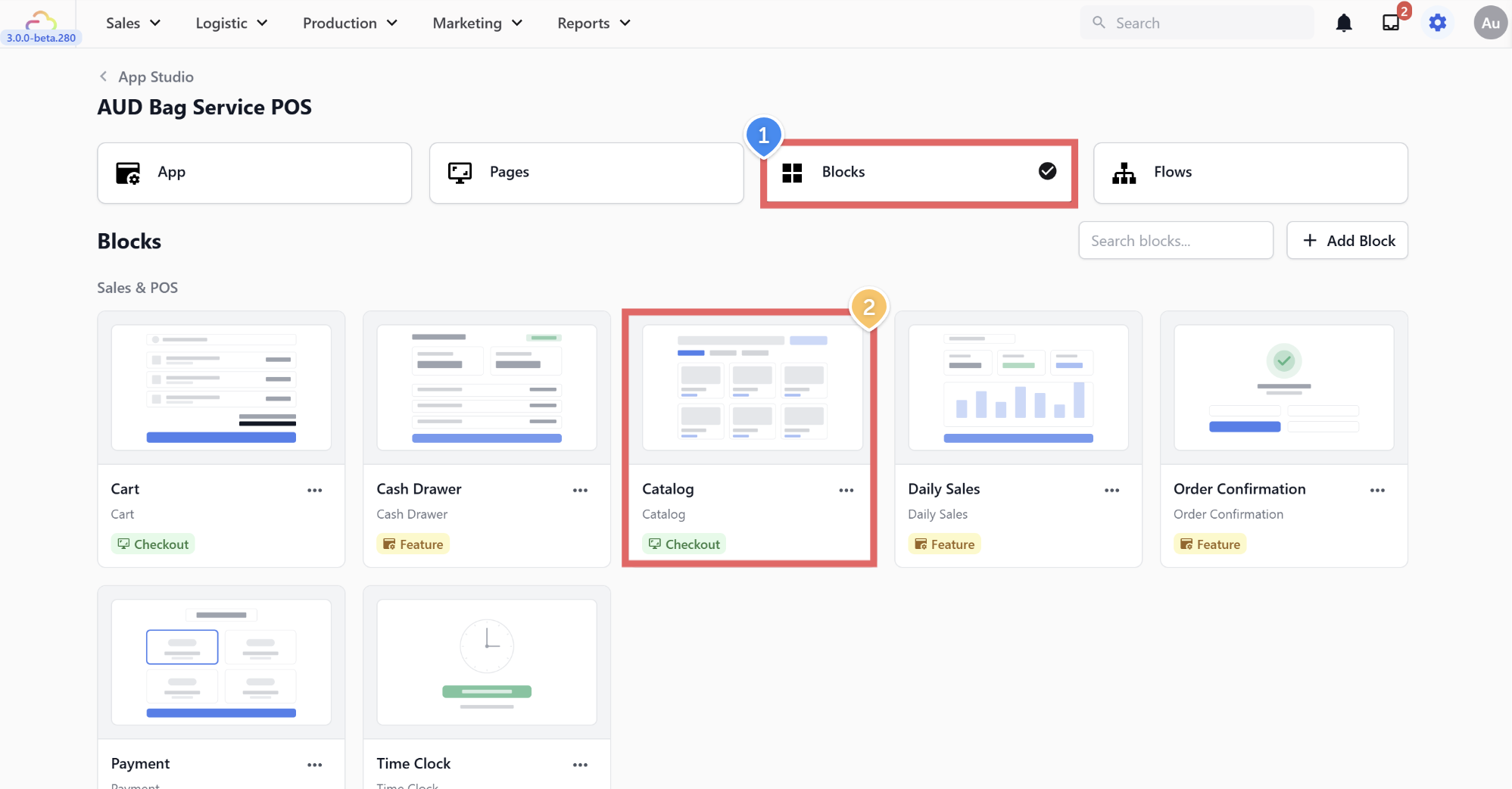 Go to the Blocks tab in App Studio. Find the block called Catalog and click on it to open its settings.