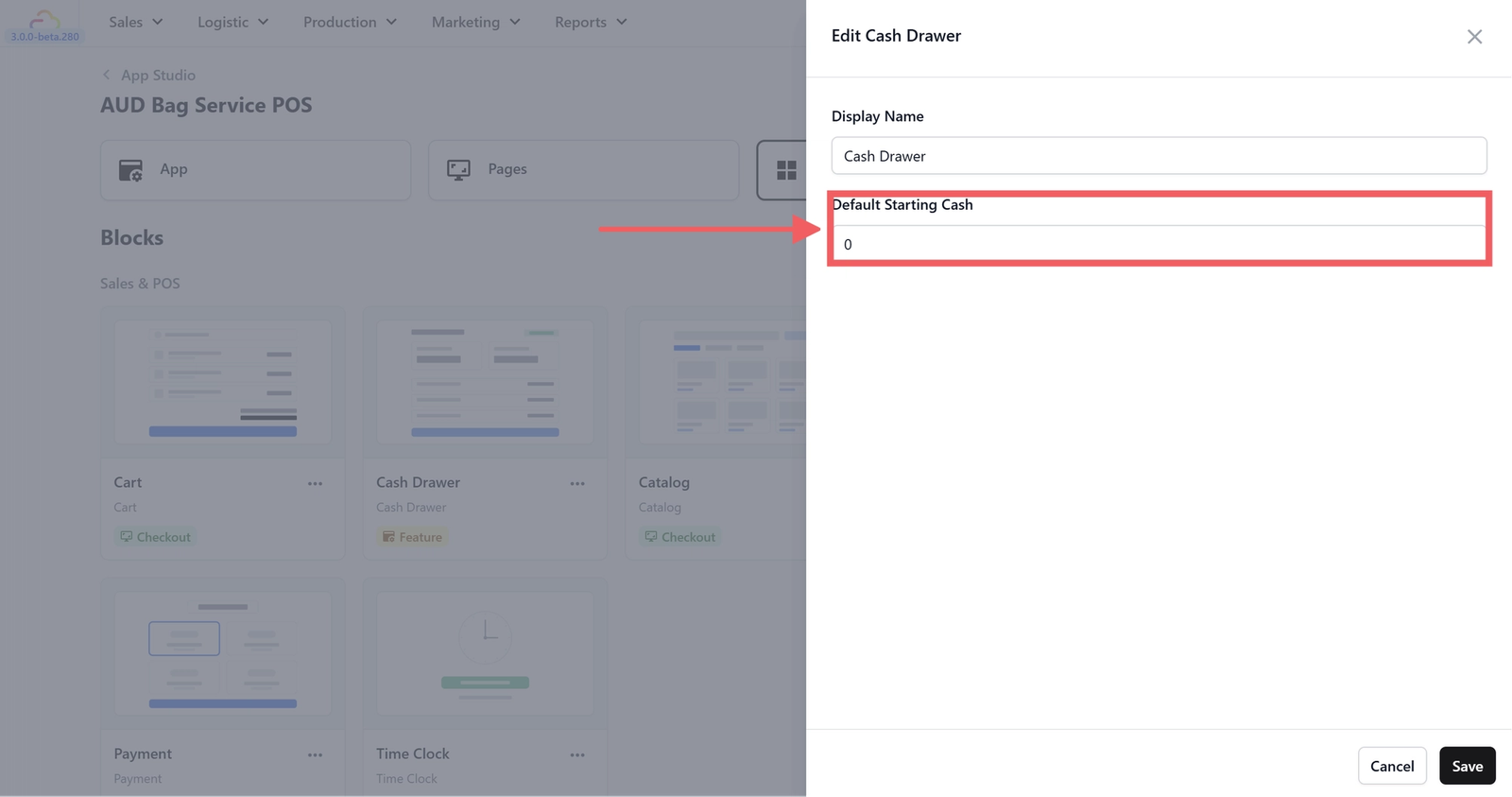 If you want to set a default starting cash amount (so your staff do not have to type it in every time), you can do this in App Studio.