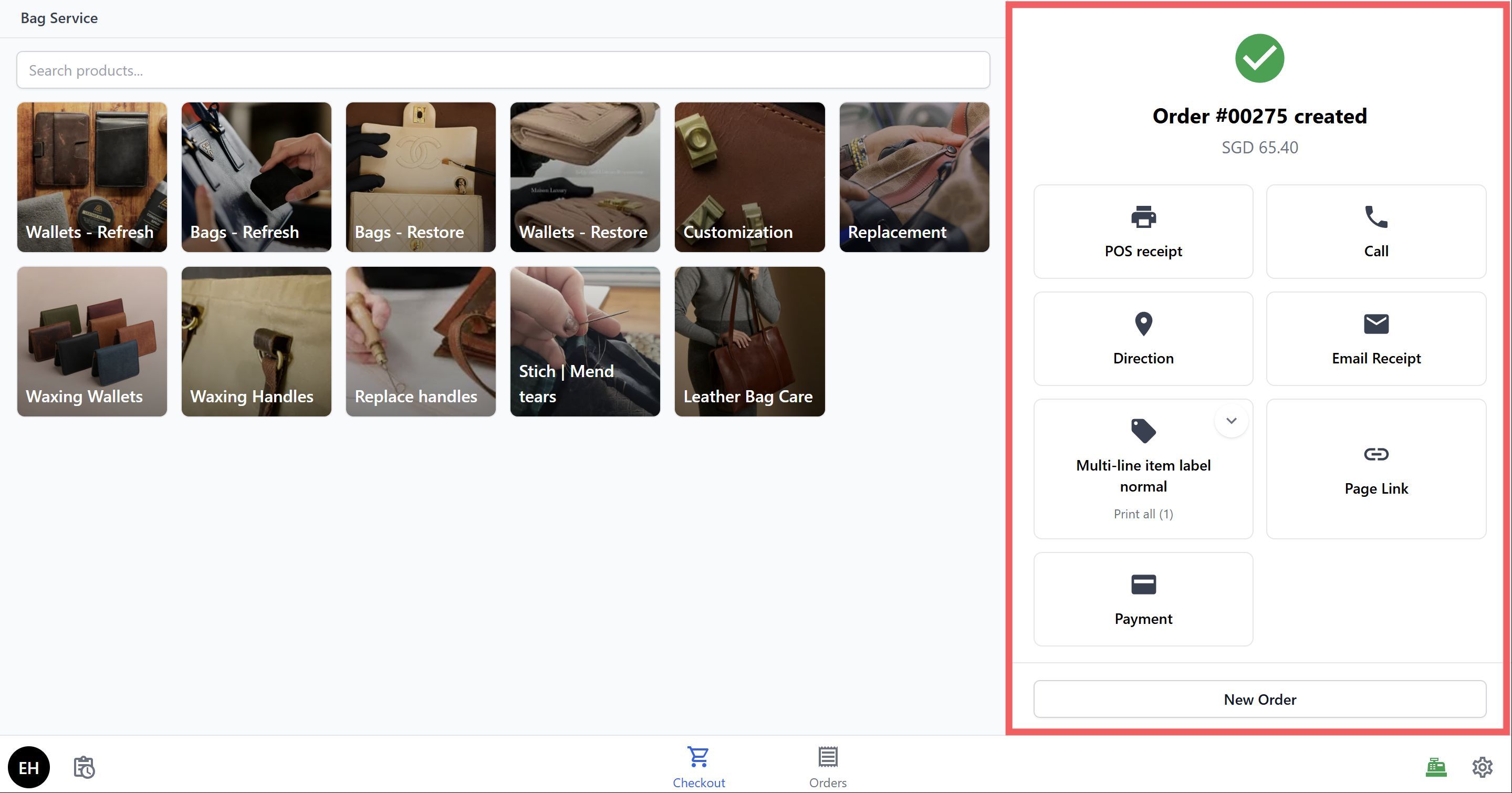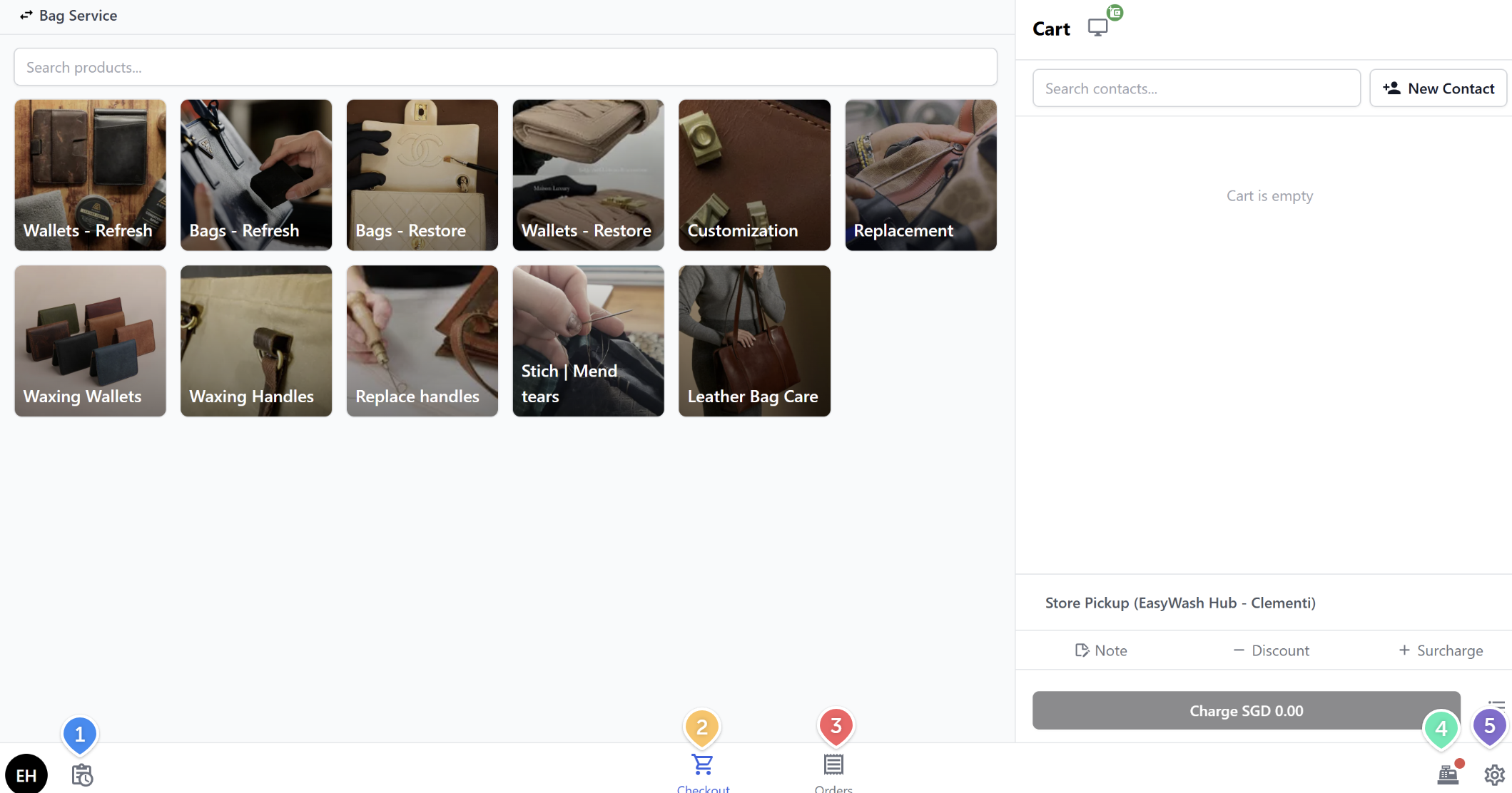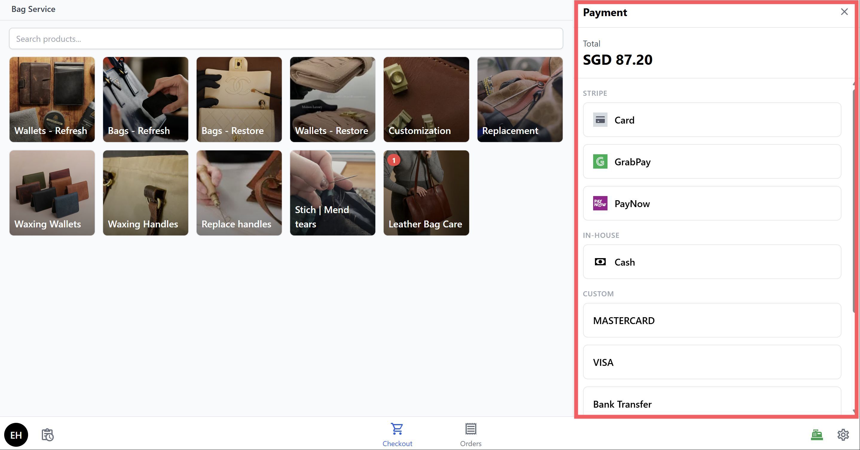 - Start taking orders — Open the Checkout screen, select a bag repair service, assign a customer, and collect payment.
