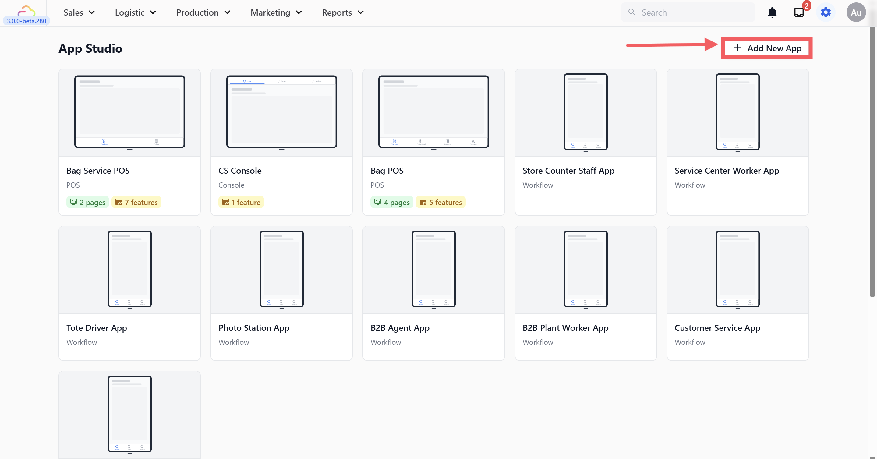 On the App Studio page, click the + Add New App button in the top right corner.