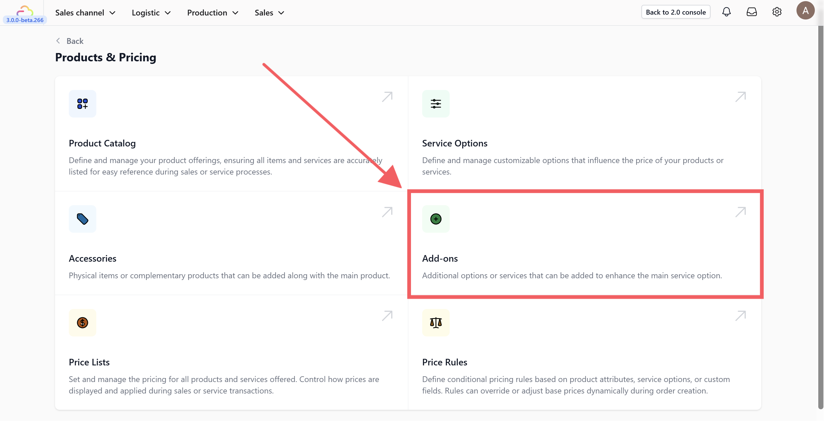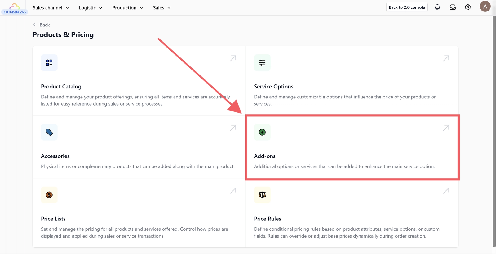 The Add-ons section allows you to define extra options or service enhancements that can be added to a main service order.