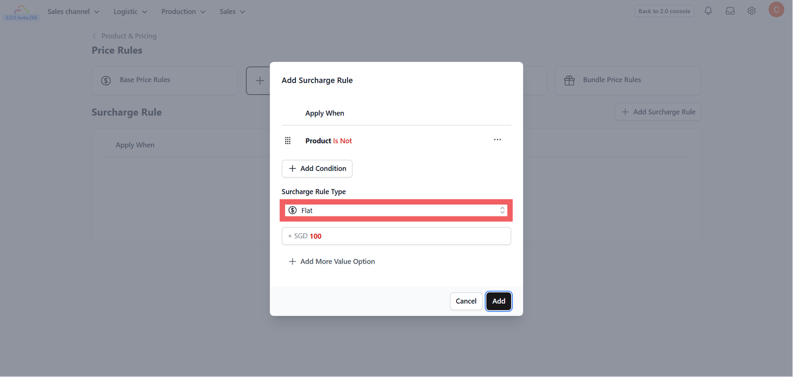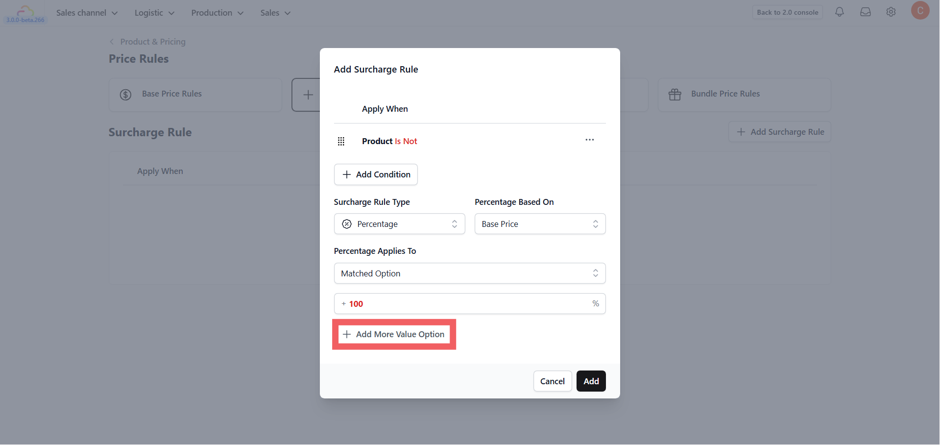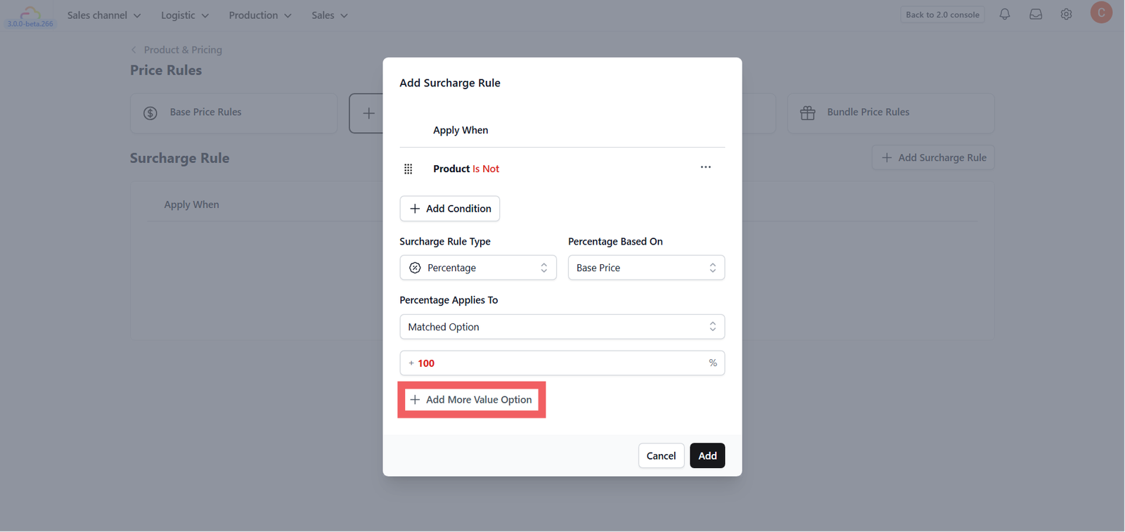 - Percentage Based On: Choose Base Price (original item price) or Accumulated Amount (item price + previous surcharges).