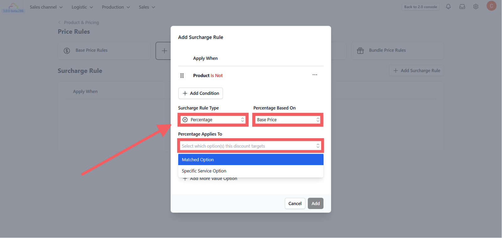 - Percentage Applies To: Choose Matched Option (applies to the specific attribute) or Specific Service Option (targets a specific service line).