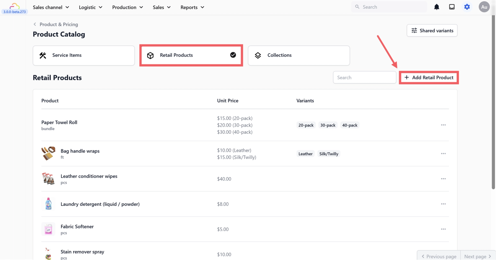 Retail Products are physical goods you sell directly to customers (e.g., Lint Rollers, Detergent).